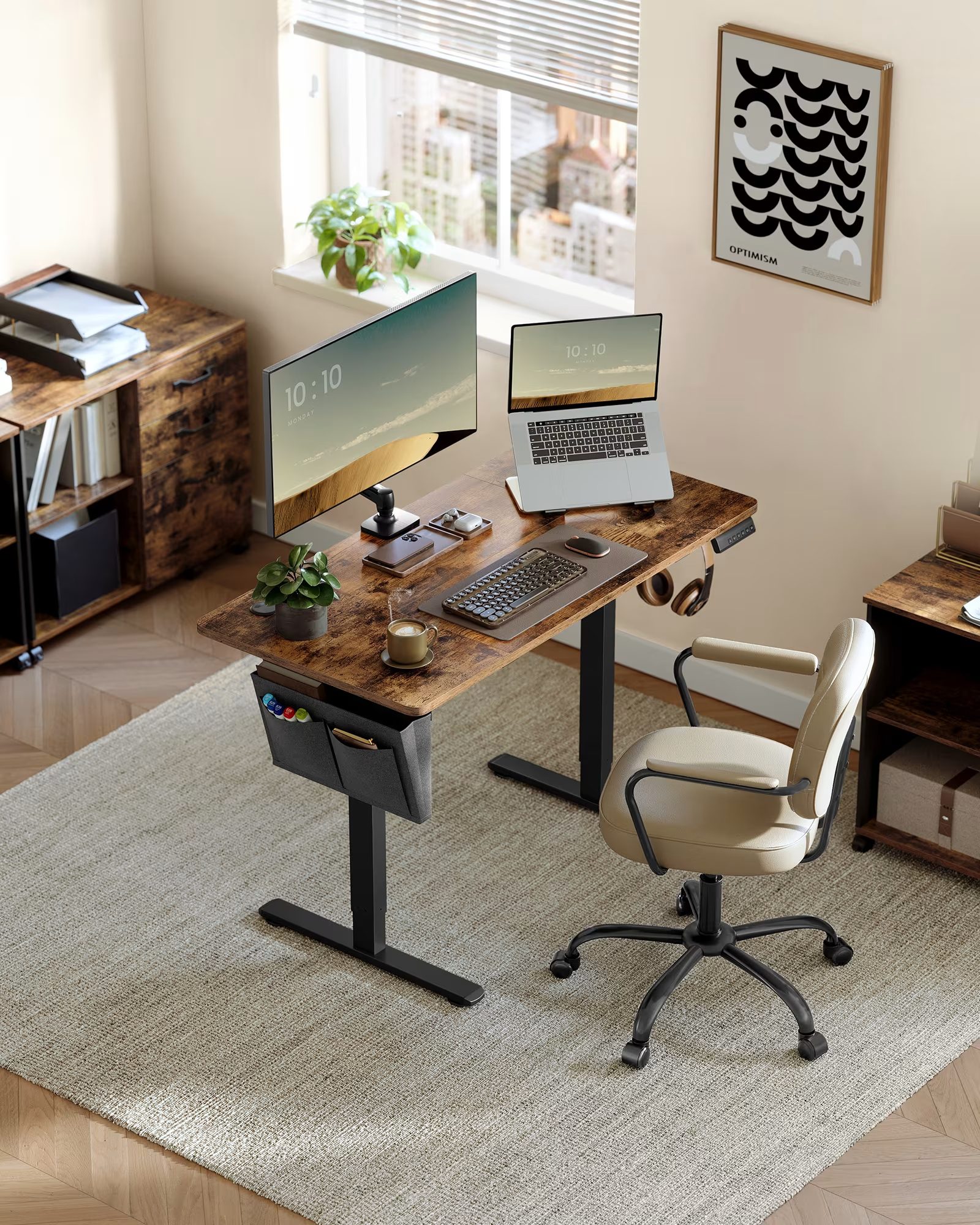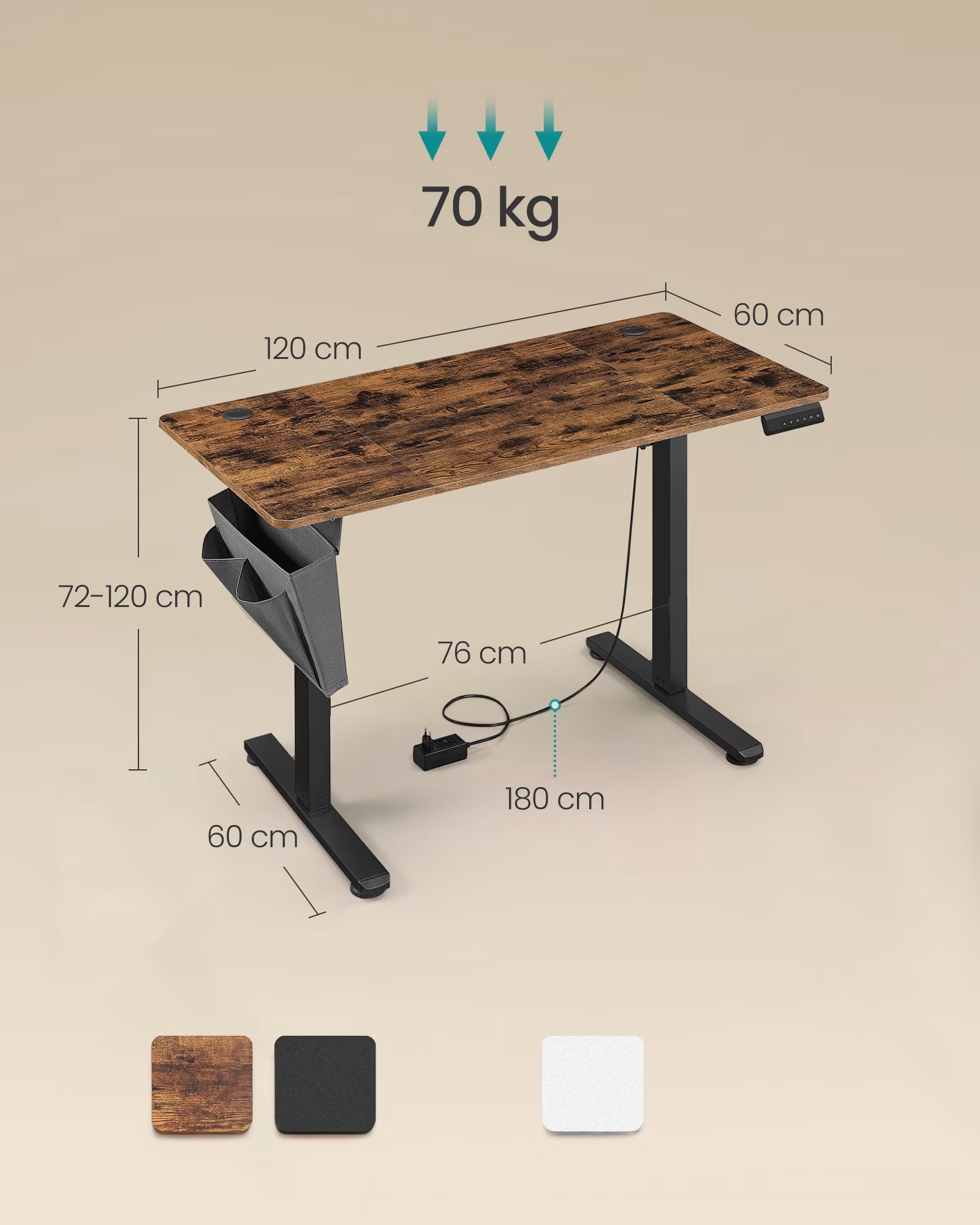 Ce bureau électrique allie style rustique et fonctionnalité moderne. Avec sa hauteur réglable, sa poche de rangement et sa construction robuste, il est idéal pour créer un espace de travail confortable et organisé, que vous préfériez être assis ou debout.