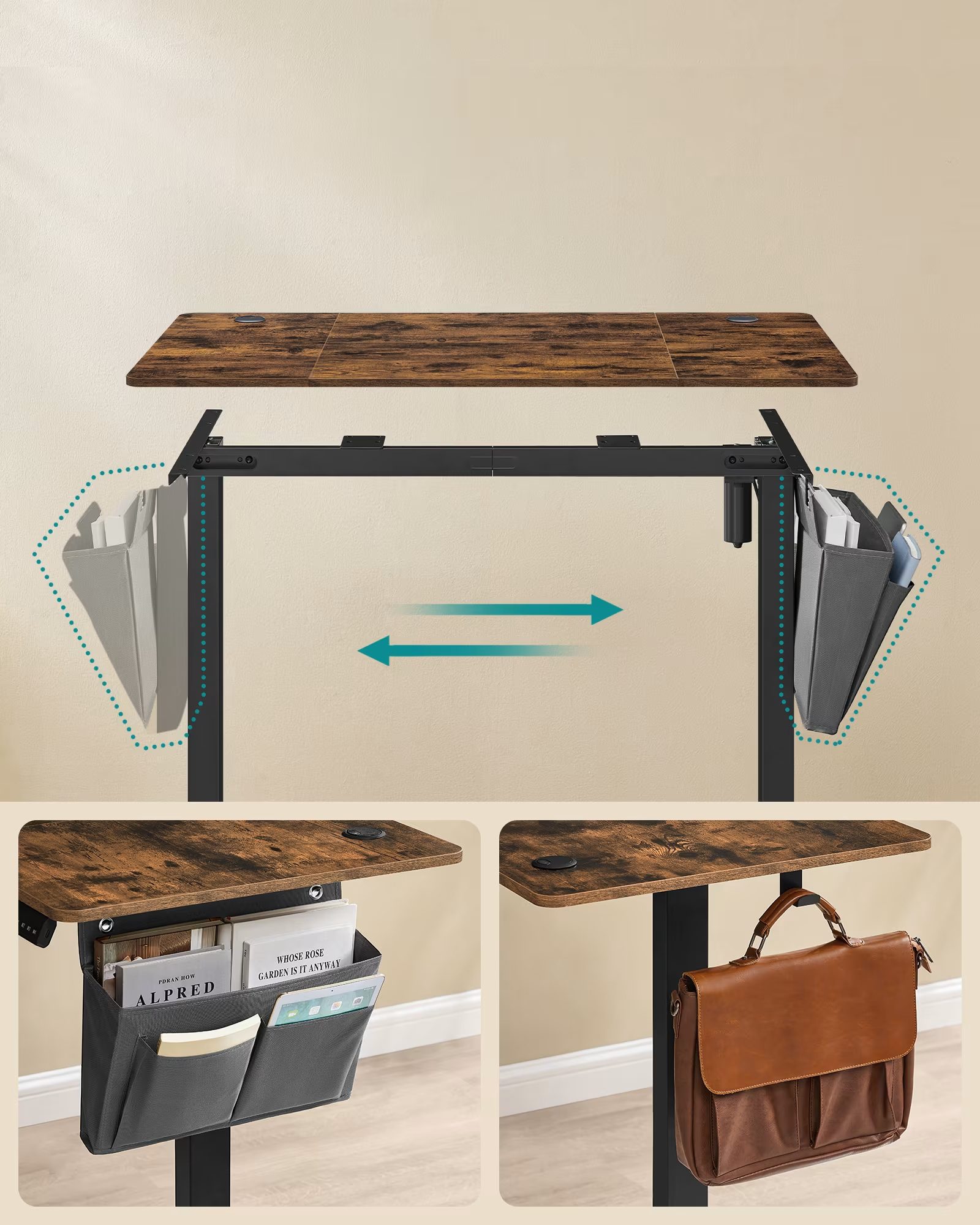 La table est également équipée d’une poche de rangement en tissu Oxford et de trois crochets, vous permettant de garder vos affaires organisées et à portée de main. Un capteur intégré protège le plateau des chocs et des rayures en détectant les obstacles lors du réglage de la hauteur.