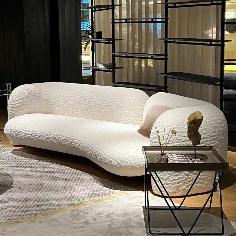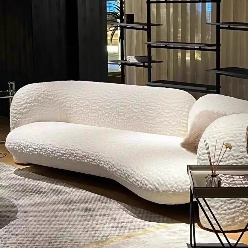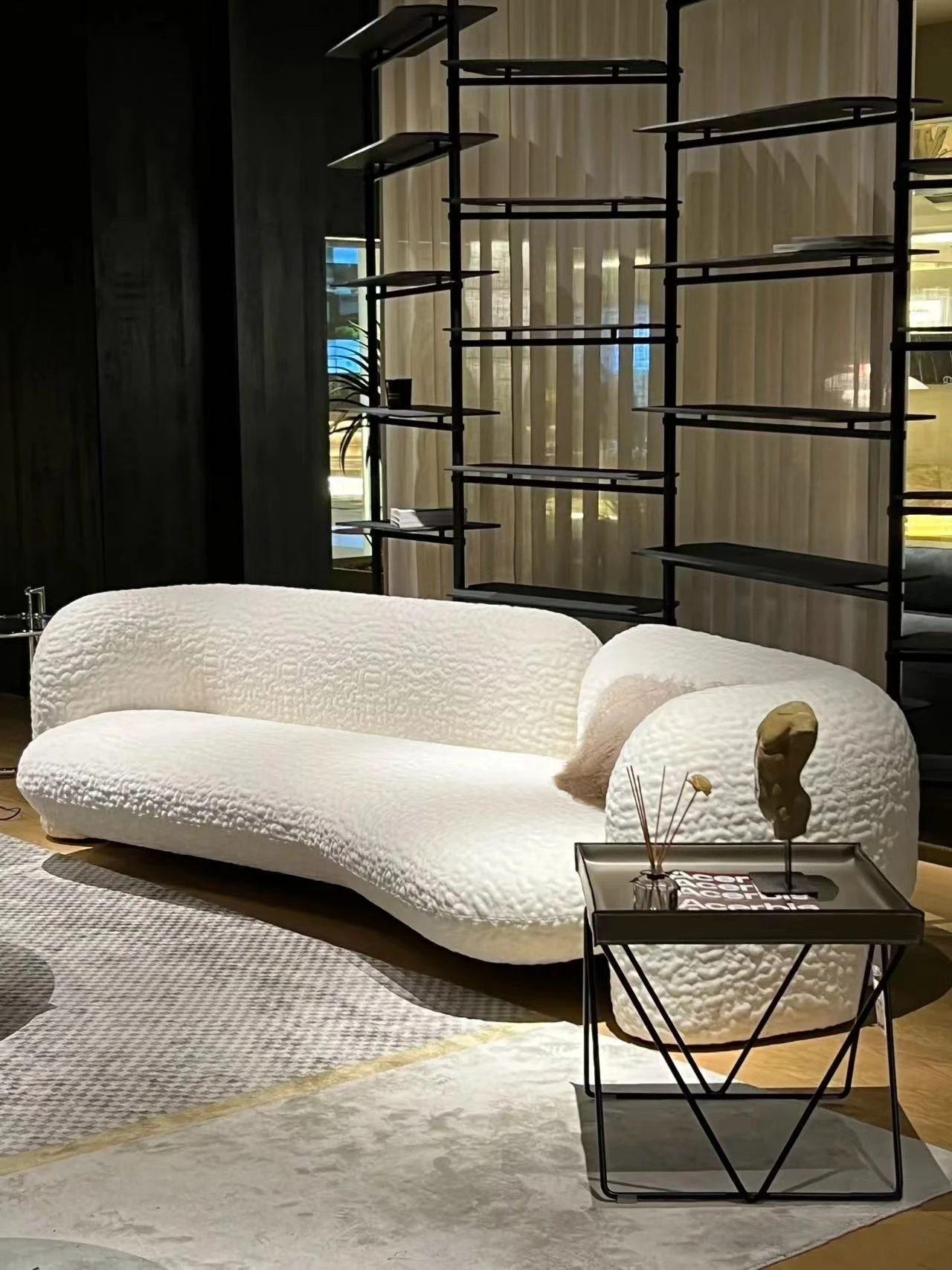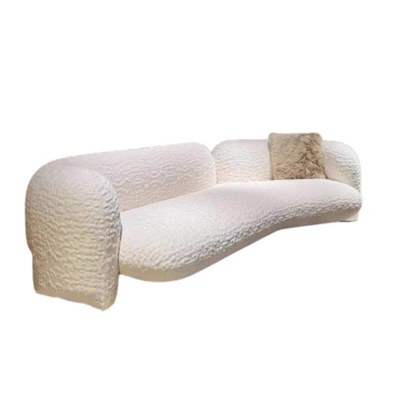 Canapé modulable en forme d’arc, recouvert de laine d’agneau pour un confort maximal. Son design minimaliste en font un ajout élégant et fonctionnel à tout salon.