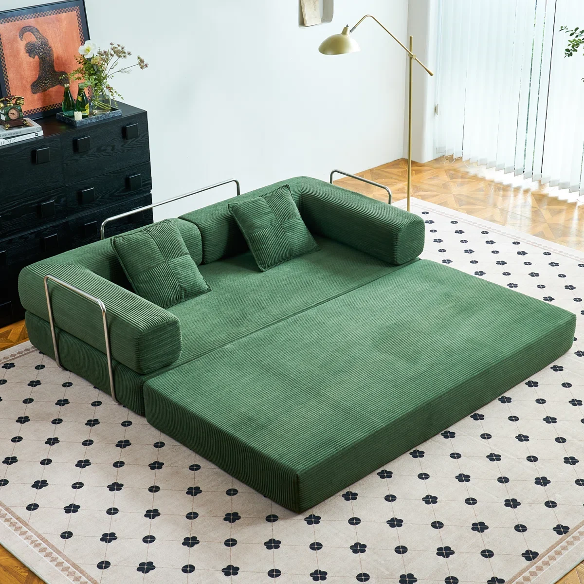 Canapé convertible en velours côtelé, idéal pour les petits espaces. Il se transforme facilement en un grand lit et ne nécessite aucun assemblage.