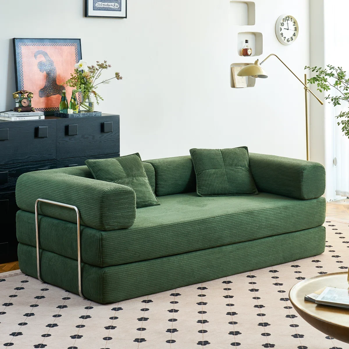 Le revêtement en velours côtelé de haute qualité est doux, confortable et ne se froisse pas facilement. Le rembourrage en éponge à haute résilience offre un soutien solide et une résistance à la déformation. Les housses sont amovibles et lavables, ce qui facilite l’entretien. Ce canapé-lit est livré sans nécessiter d’assemblage.