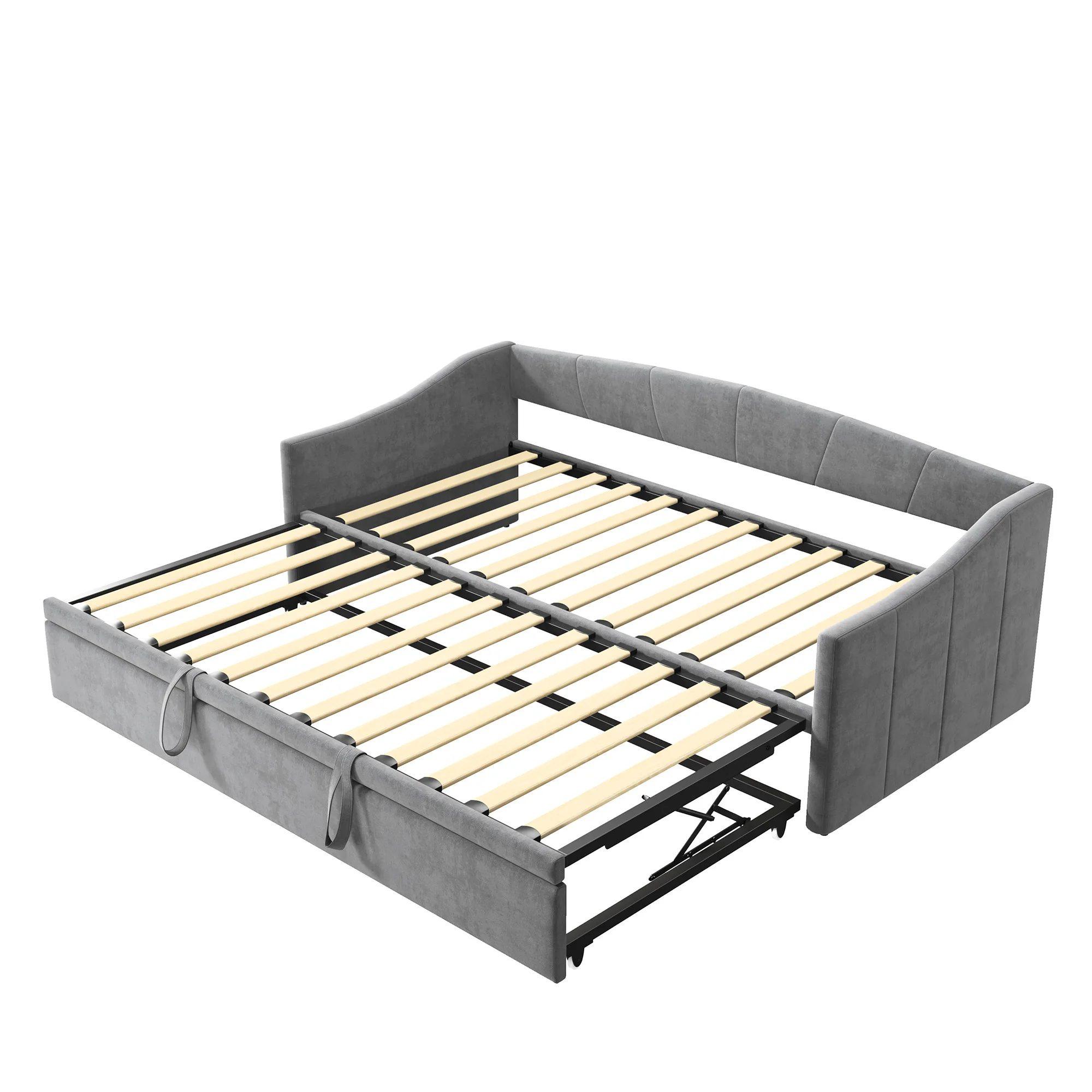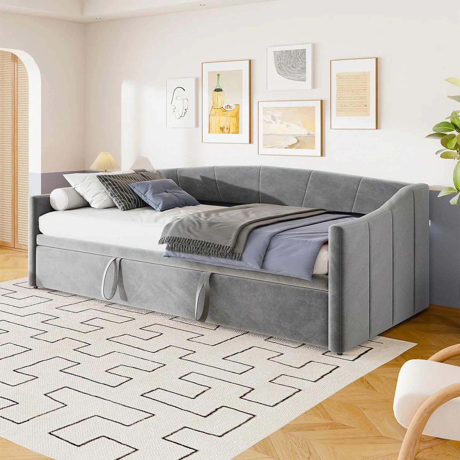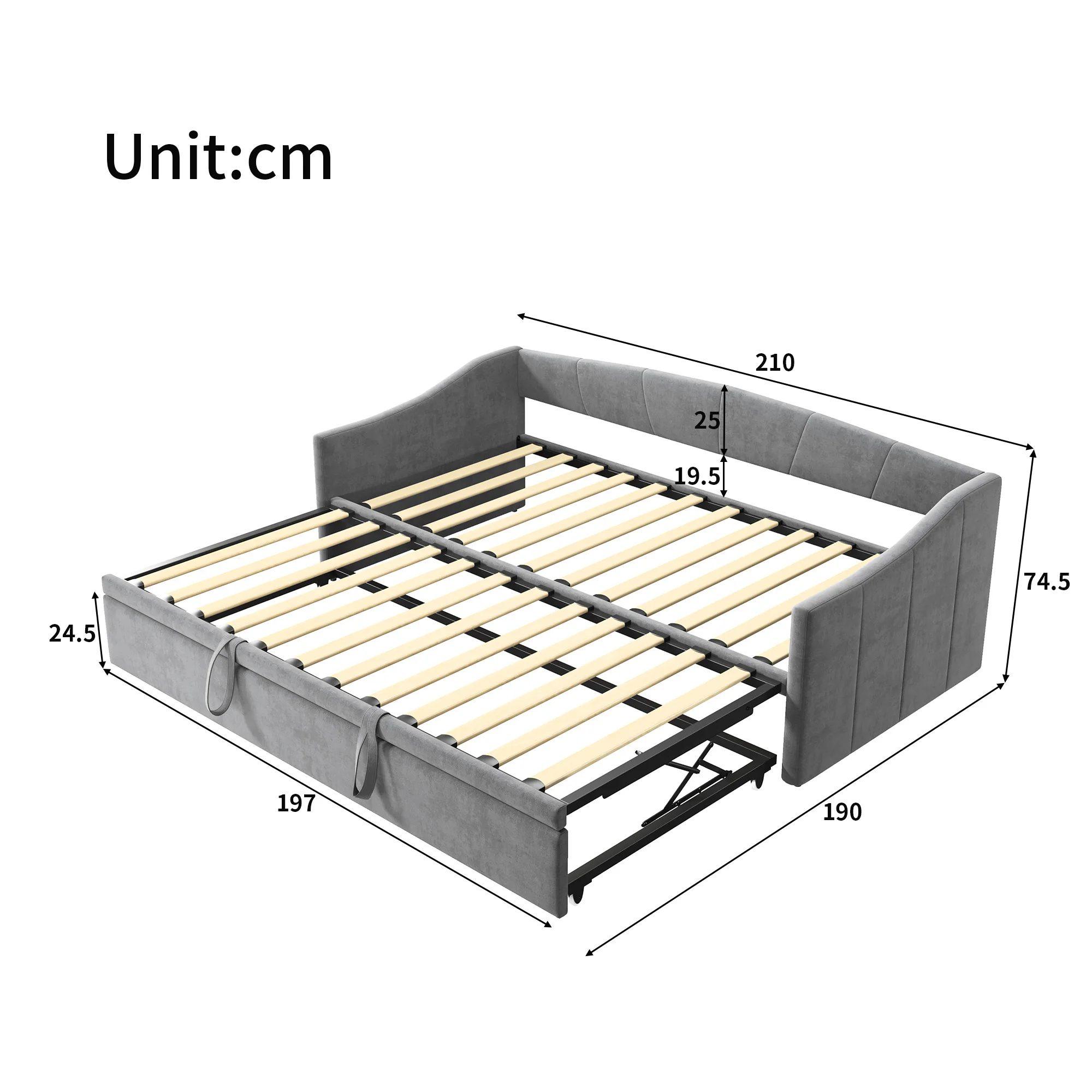 Canapé-lit extensible en velours, idéal pour les petits espaces. Il se transforme facilement en un lit double de 180 x 200 cm et offre un confort optimal pour la détente.