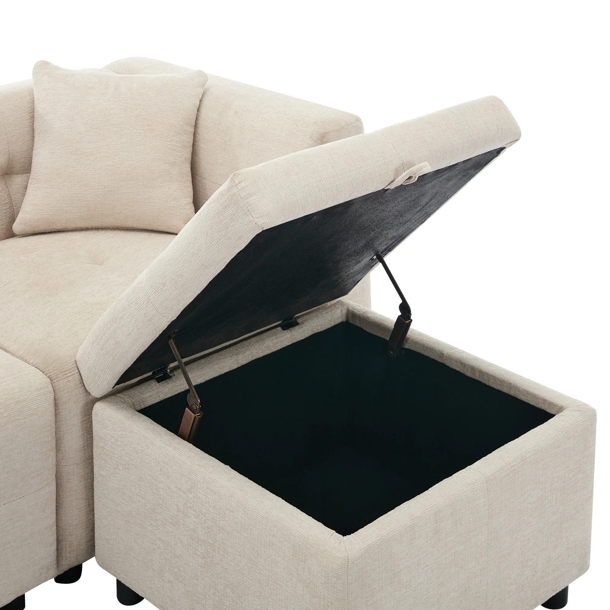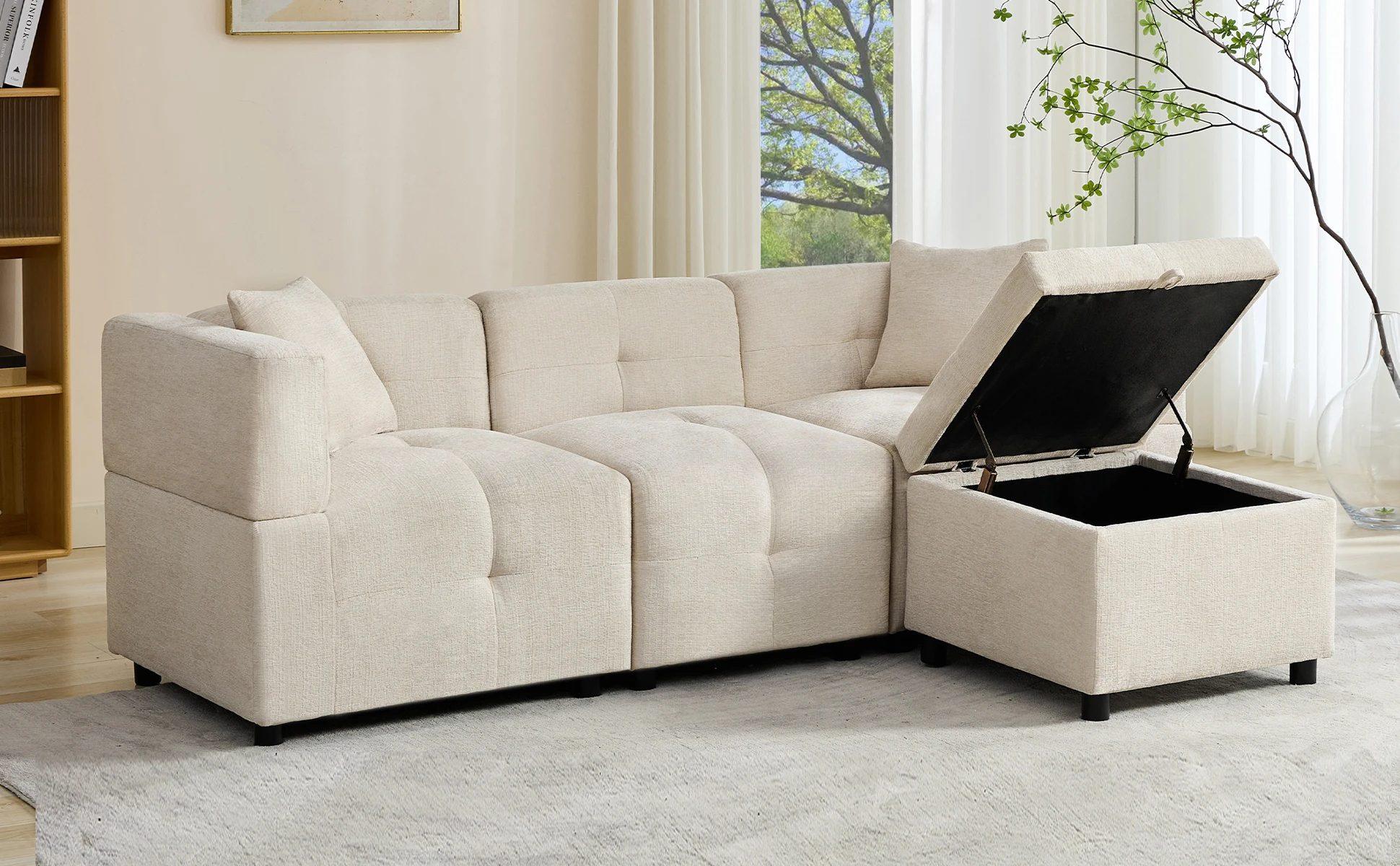 Canapé modulable au design contemporain avec coffre de rangement intégré, idéal pour optimiser l’espace.