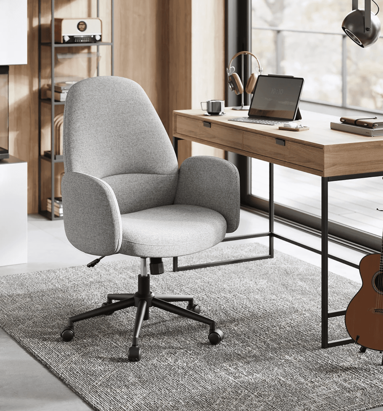 Cette chaise de bureau allie un design contemporain et minimaliste à un confort exceptionnel. Son revêtement en tissu coton-lin gris tourterelle est à la fois respirant et doux pour la peau, parfait pour de longues heures d’utilisation. Le dossier et les accoudoirs sont rembourrés avec de la mousse à mémoire de forme pour un soutien ergonomique, réduisant la pression et la fatigue.