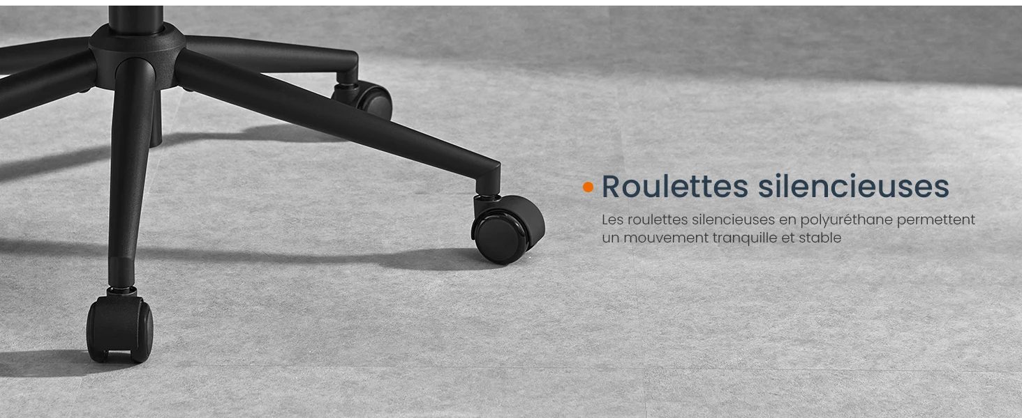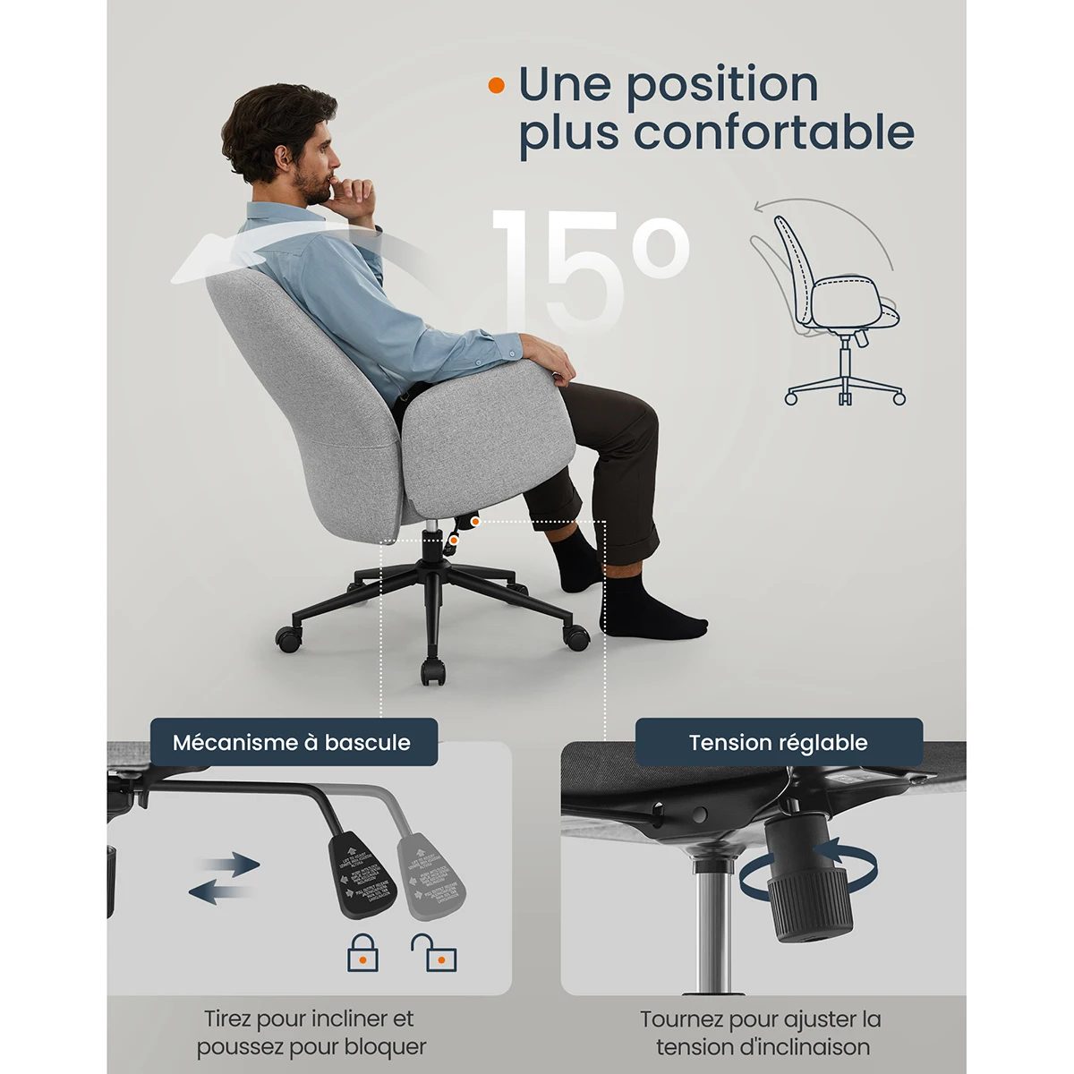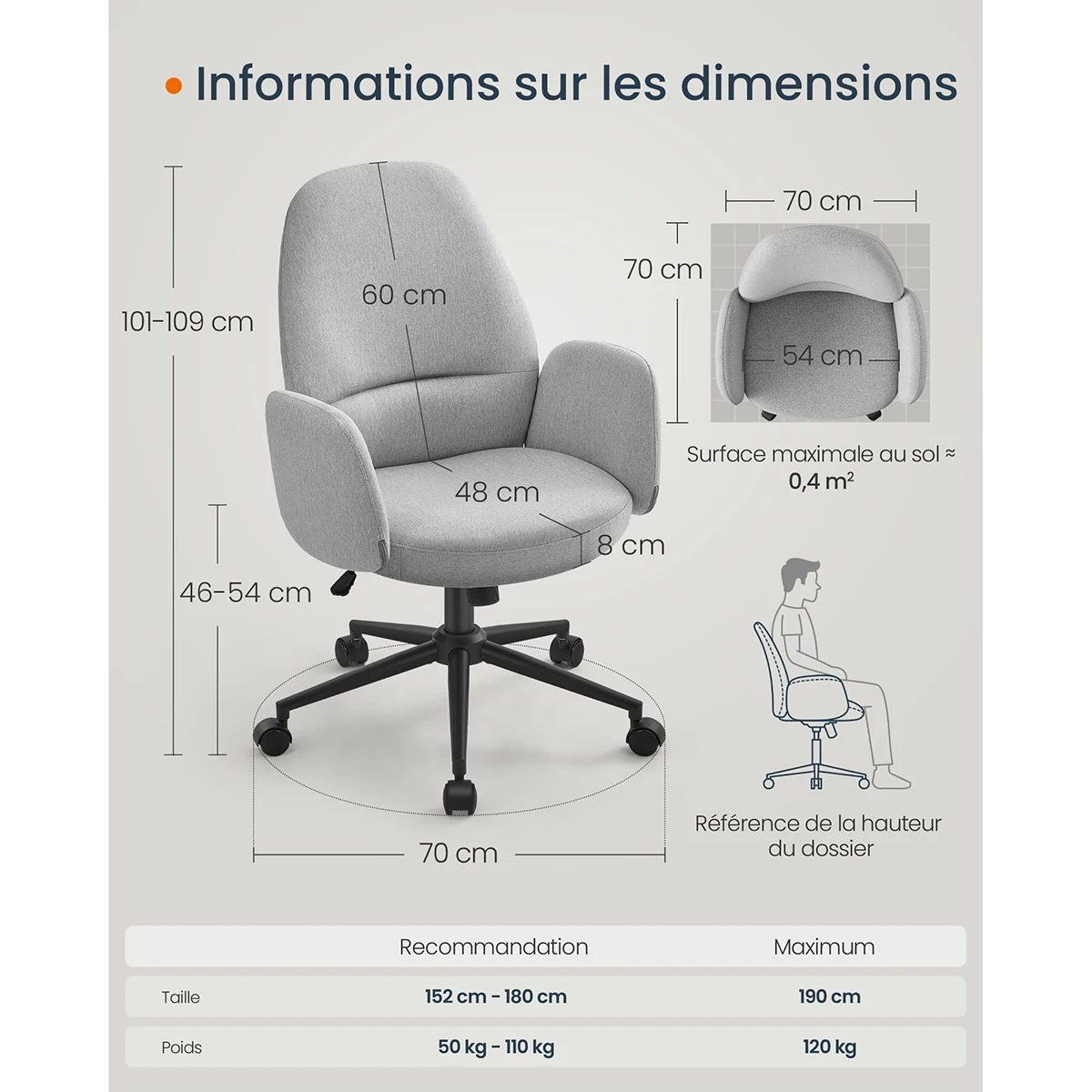 - Fonctionnalités : Hauteur réglable, inclinaison du dossier de 90 à 105°, roulettes silencieuses