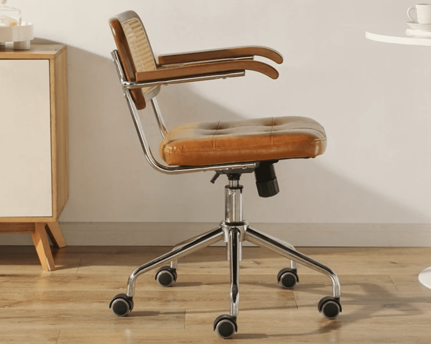 Cette chaise de bureau en rotin et cuir, au design rétro-japonais, offre un mélange parfait de style et de confort. Avec sa rotation à 360° et ses roulettes silencieuses, elle est idéale pour toute sorte d’environnement, que ce soit un bureau ou un restaurant.