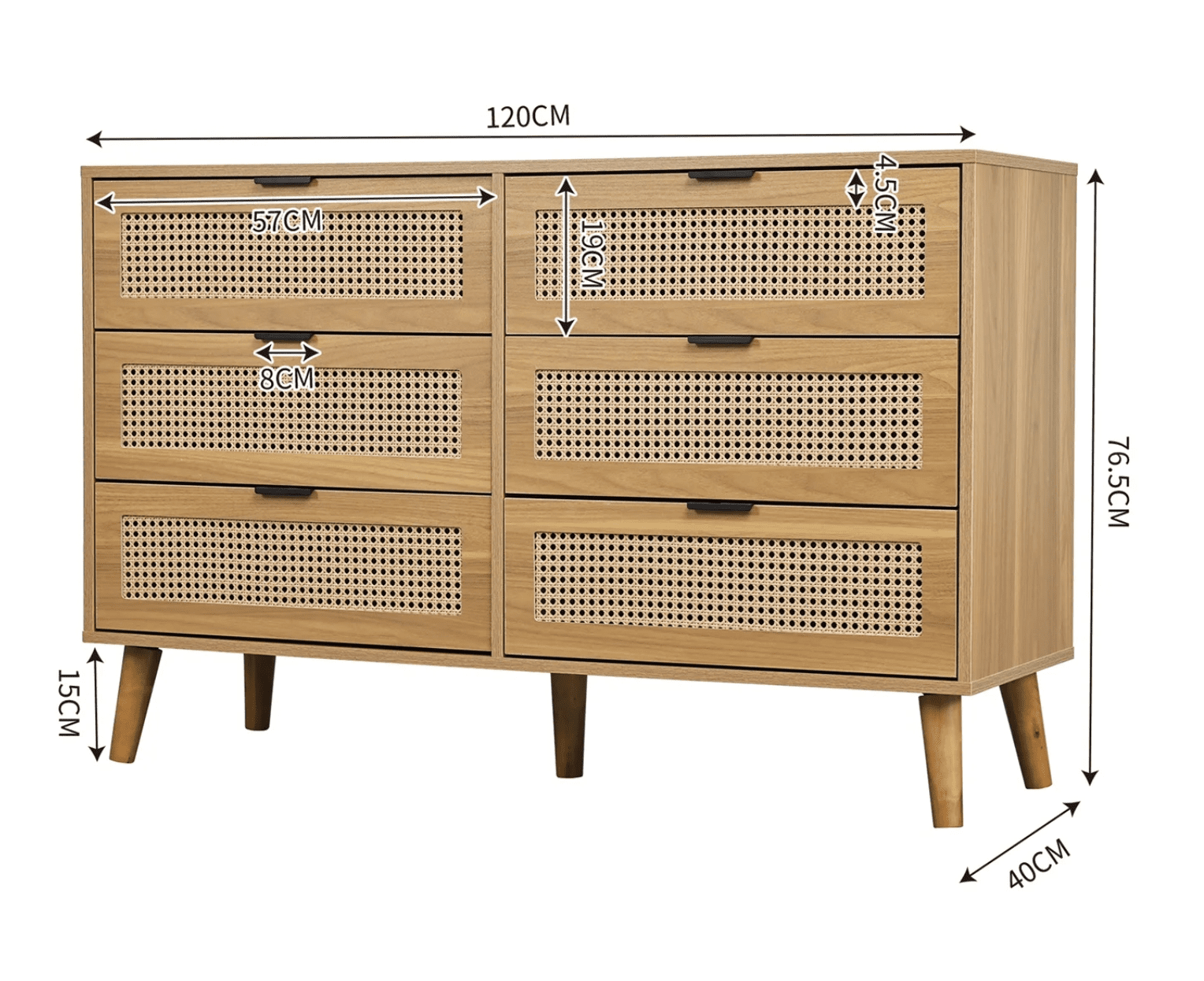 Commode de rangement au design rétro, intégrant un motif classique de rotin/cannage avec une finition couleur Noyer. Équipée de six tiroirs spacieux et de poignées métalliques, elle repose sur des pieds surélevés en bois massif.
