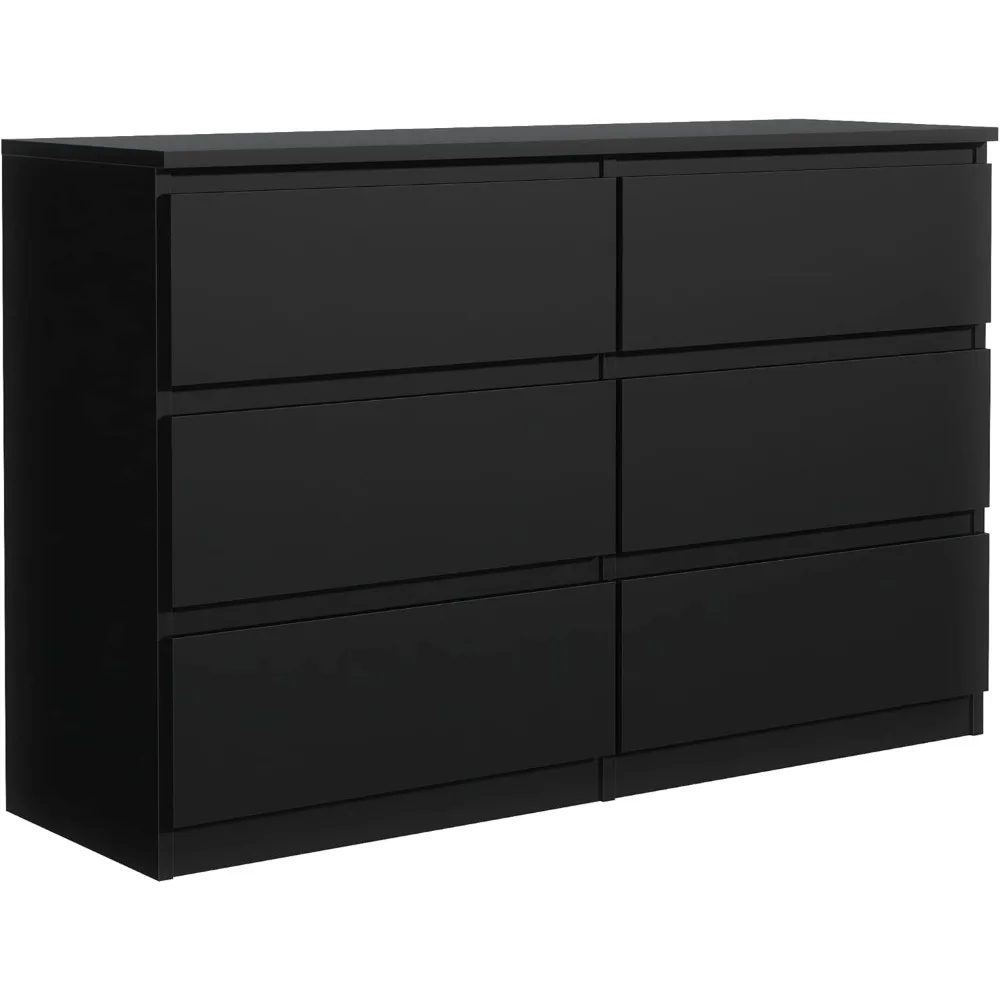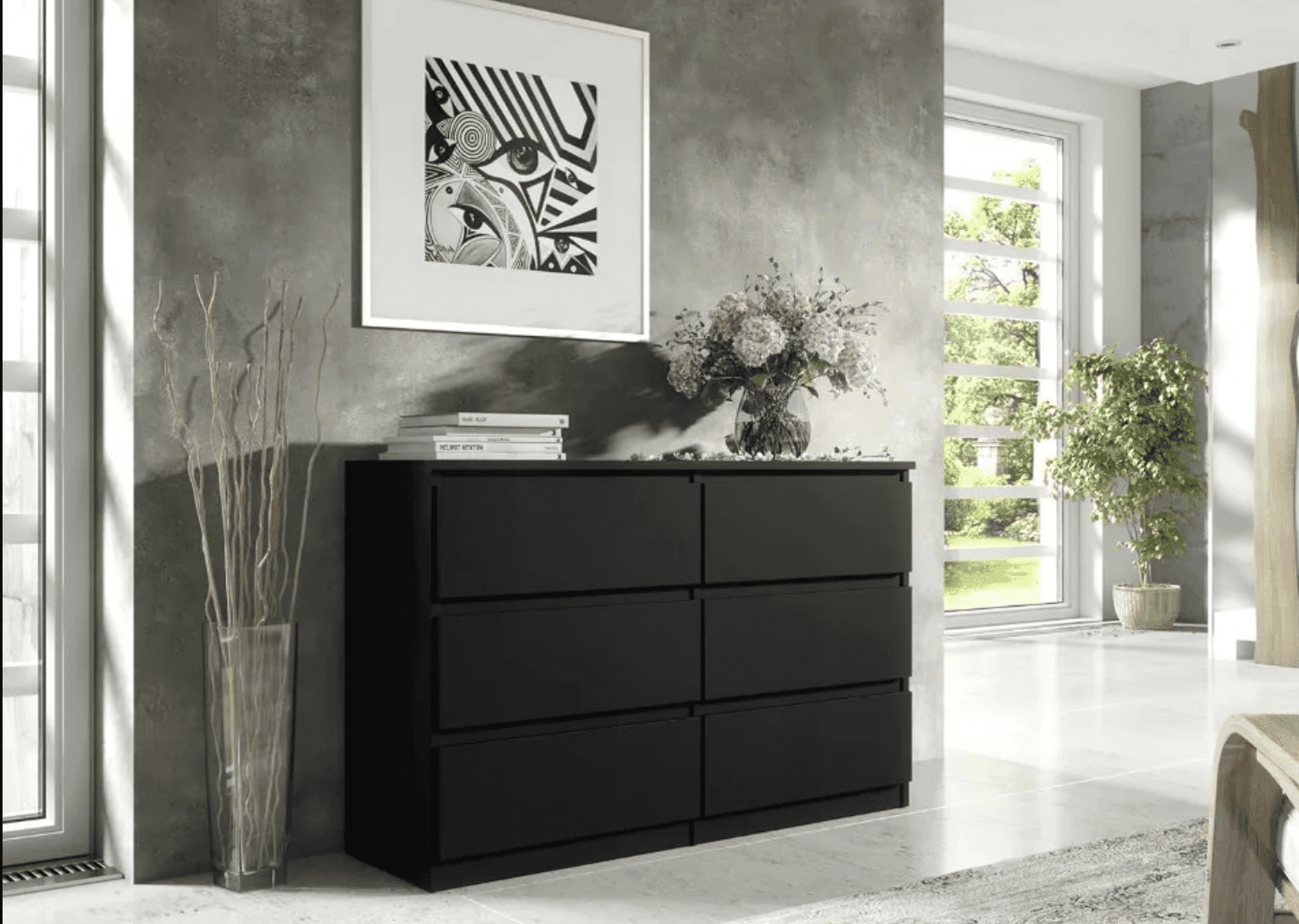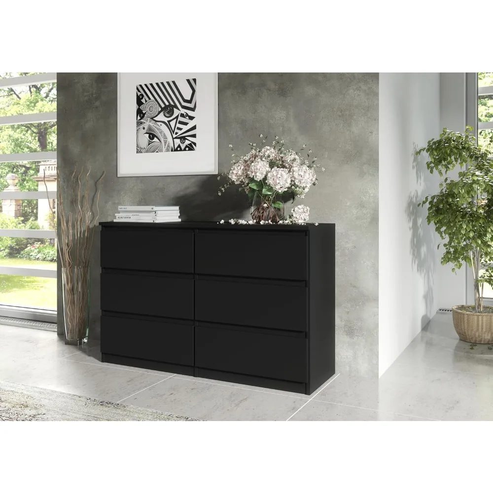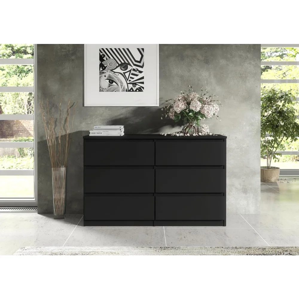 Commode de rangement de style scandinave au design épuré, offrant six tiroirs spacieux pour la chambre. Elle se distingue par une finition noir brillant, ajoutant une touche moderne et élégante à tout intérieur.