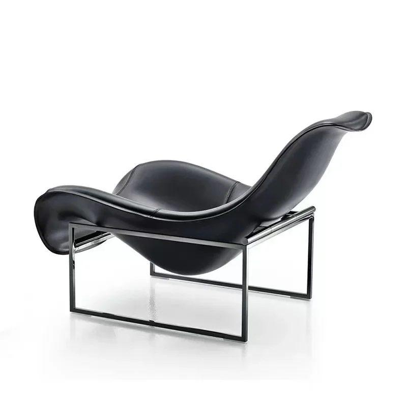 Cette chaise longue est la pièce maîtresse idéale pour un salon ou un coin détente, alliant un style moderne audacieux et un confort exceptionnel. Son design unique repose sur une coque en fibre de verre recouverte de cuir de haute qualité, offrant un soutien enveloppant pour une relaxation totale.