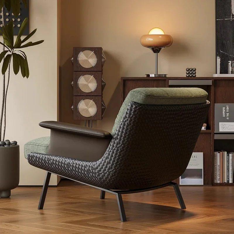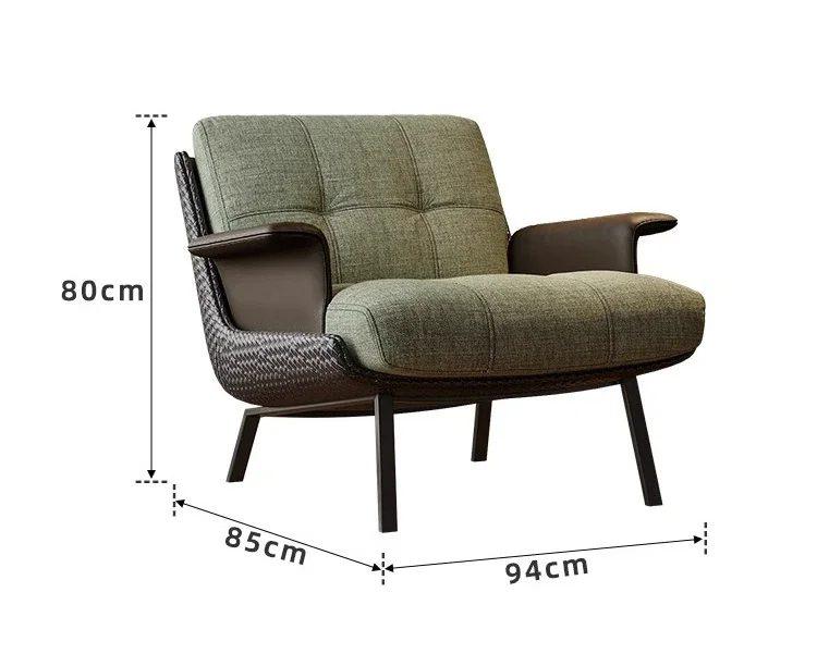 Ce fauteuil est l’incarnation du style « luxe léger » qui combine des lignes simples avec des matériaux de haute qualité. Le siège et le dossier sont recouverts d’un tissu texturé de couleur verte, avec un matelassage distinctif qui ajoute une touche de raffinement. Les accoudoirs, ainsi que les côtés du fauteuil, sont recouverts d’un revêtement cuir marron foncé, créant un contraste visuel élégant.