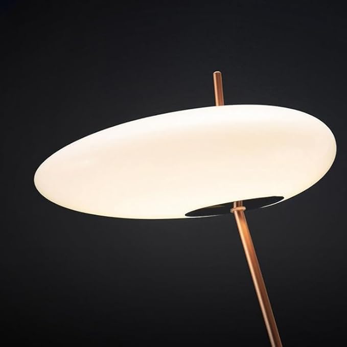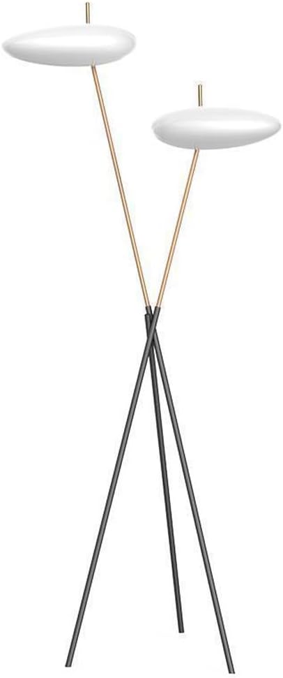 Le lampadaire est une pièce de décoration qui incarne le style moderne et minimaliste avec une touche de luxe et de créativité. Sa structure repose sur un piètement trépied croisé en Fer noir, d’où émergent deux tiges fines, souvent dorées, soutenant deux abat-jours plats et diffusants en Acrylique. Les têtes en forme de soucoupe ou de disque rappellent l’esthétique scandinave.
