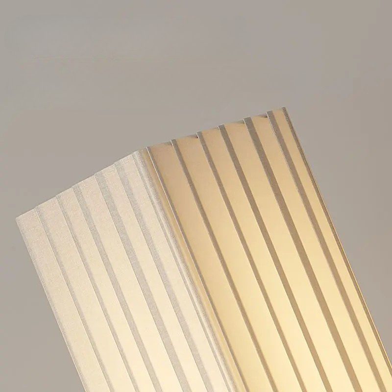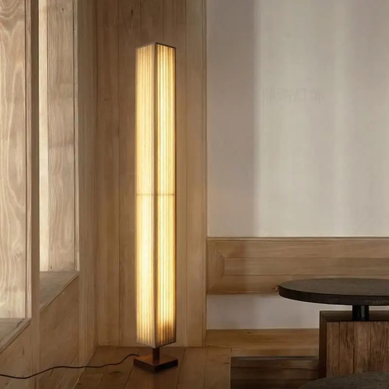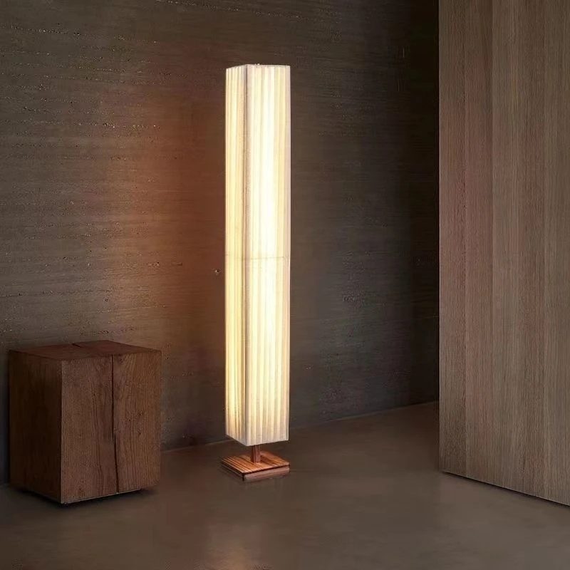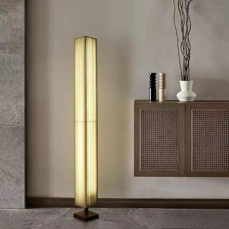 Lampadaire colonne très haut au design minimaliste et rectangulaire. Son abat-jour plissé diffuse une lumière chaude et uniforme, créant une ambiance zen et moderne.