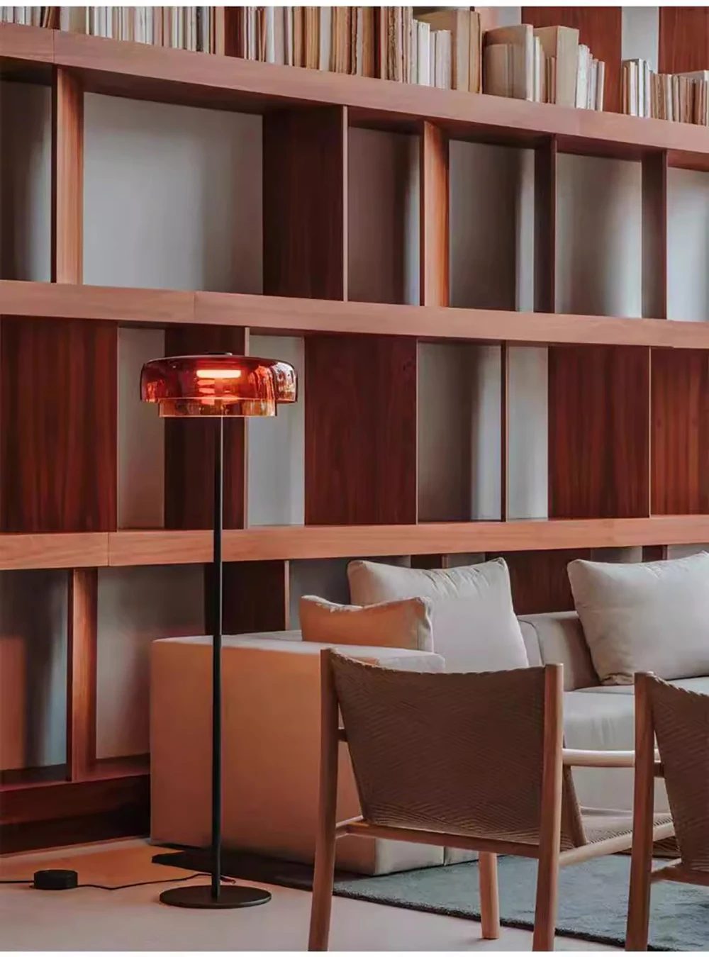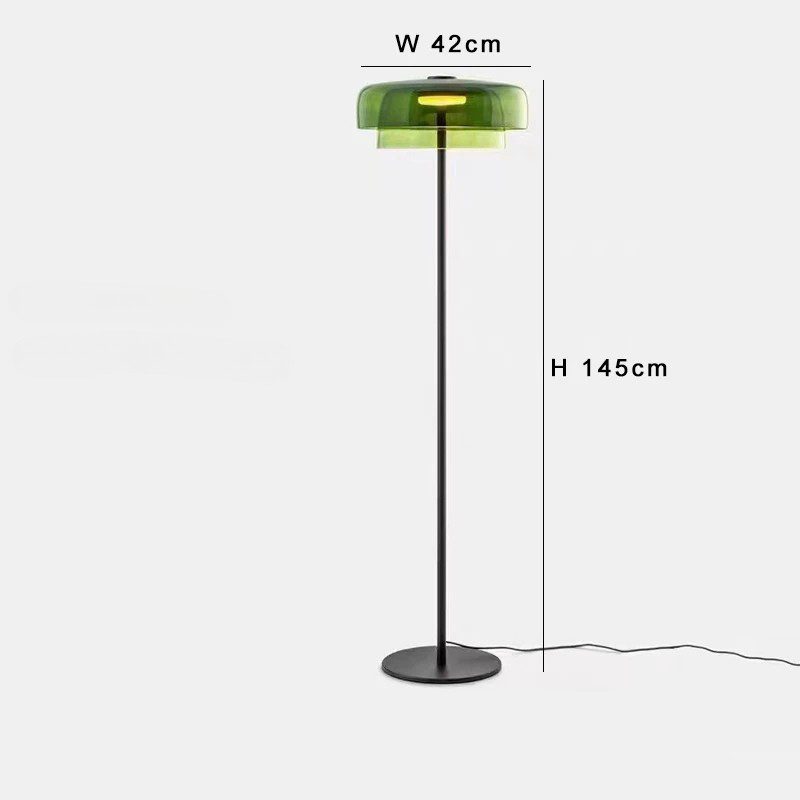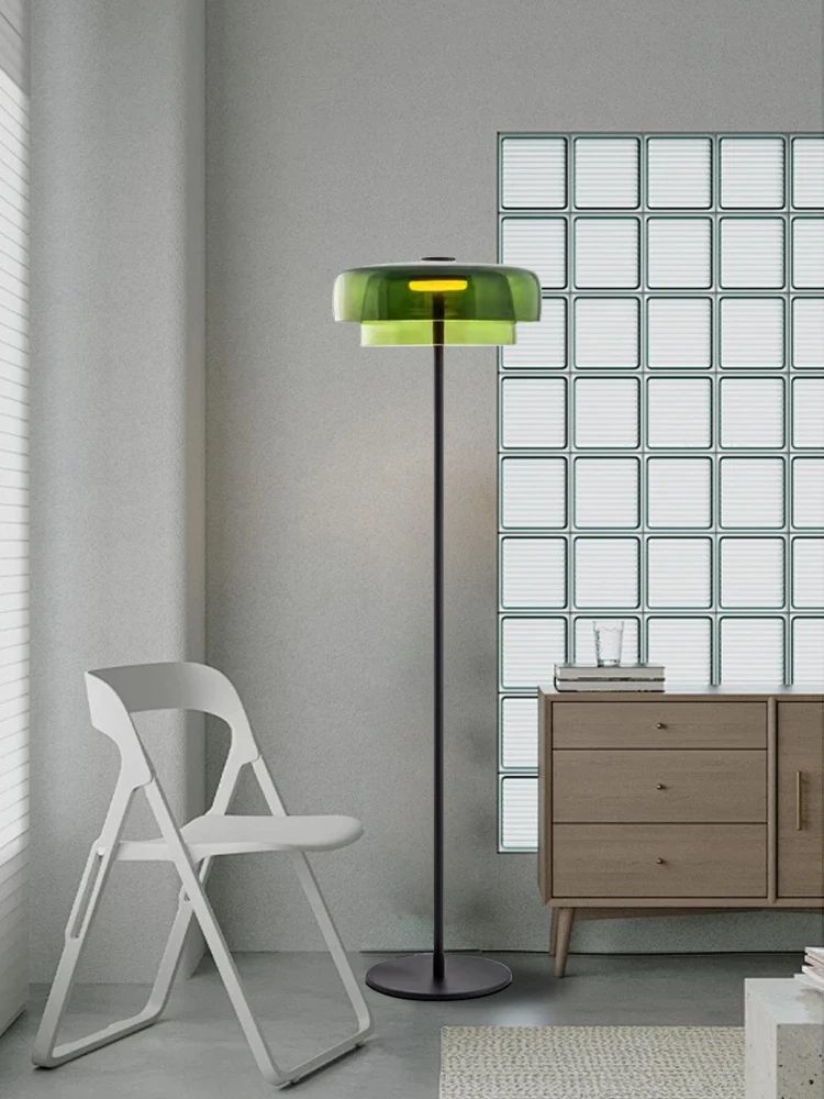Ce lampadaire s’inscrit dans le mouvement du luxe léger scandinave, combinant une esthétique minimaliste avec des matériaux haut de gamme. Le design se caractérise par un abat-jour double superposé en Verre, monté sur un mât très fin et une base stable en Acier Inoxydable, dont la finition est un Acier Poli. La forme et les couleurs (vert/orange/gris) en font une véritable pièce d’art décoratif.