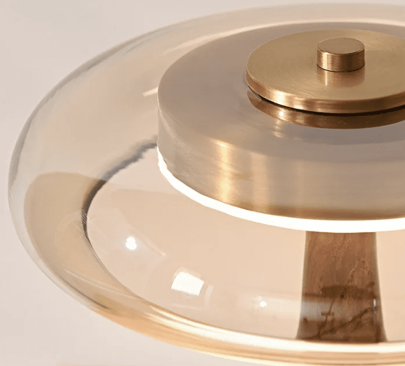 L’abat-jour est en Verre Teinté, conçu pour projeter une lumière chaude, invitante et une ambiance unique dans votre pièce.