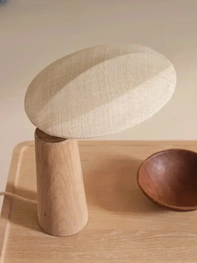 Lampe de table Wabi-sabi/Zen au design rétro et artistique. Elle combine une base en Bois et Fer avec un abat-jour en Tissu de lin au fini gravé.