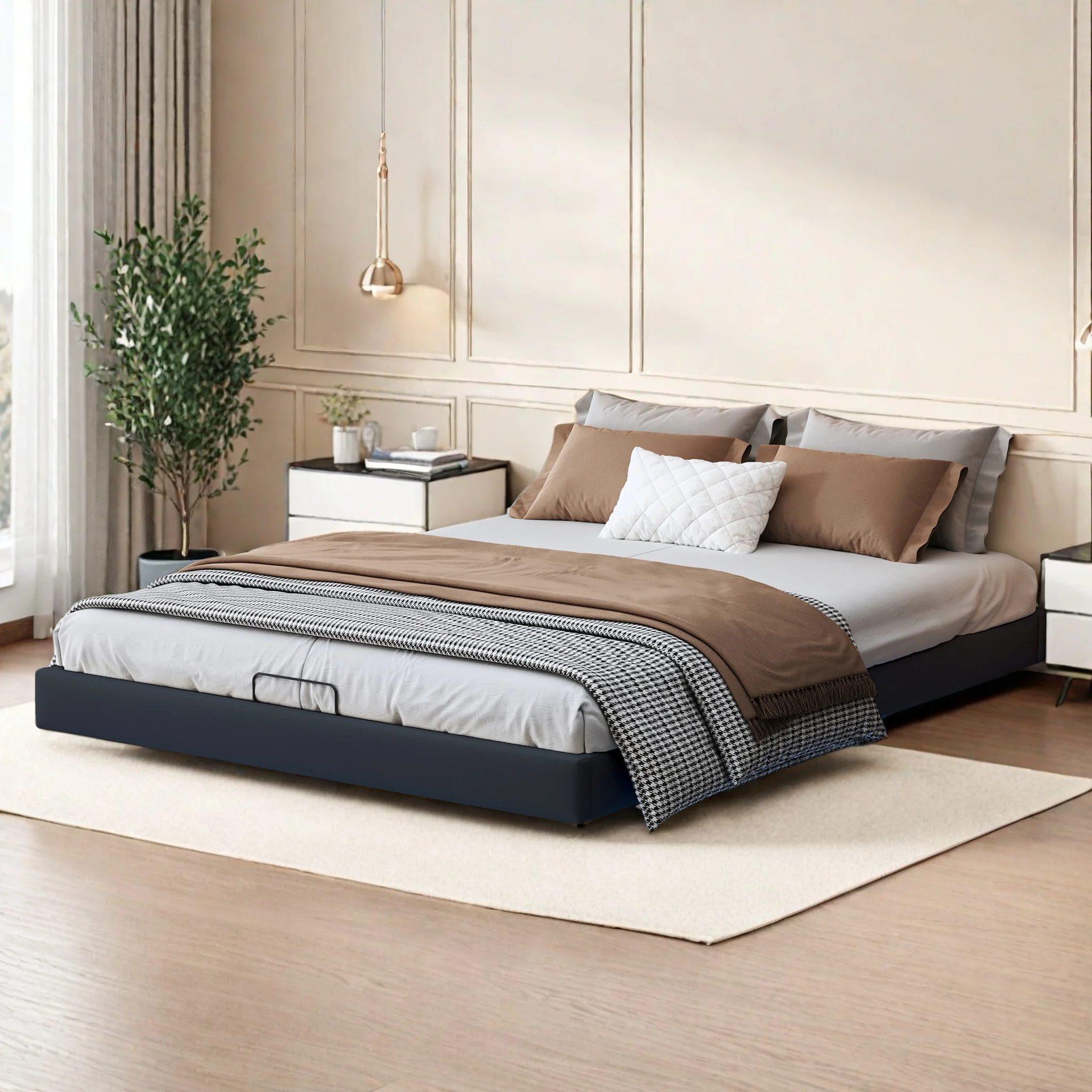Ce lit « flottant » de 160 x 200 cm est doté de LED lumineuses contrôlables, d’un espace de rangement hydraulique et d’un cadre solide en métal et en bois. Il combine un design spectaculaire et une fonctionnalité exceptionnelle pour moderniser votre chambre.
