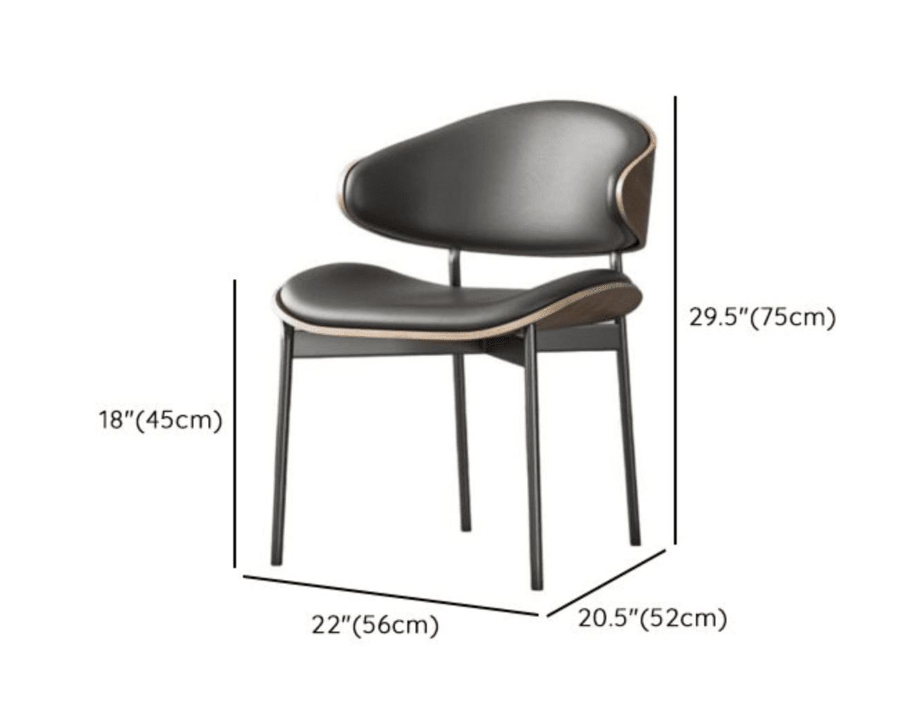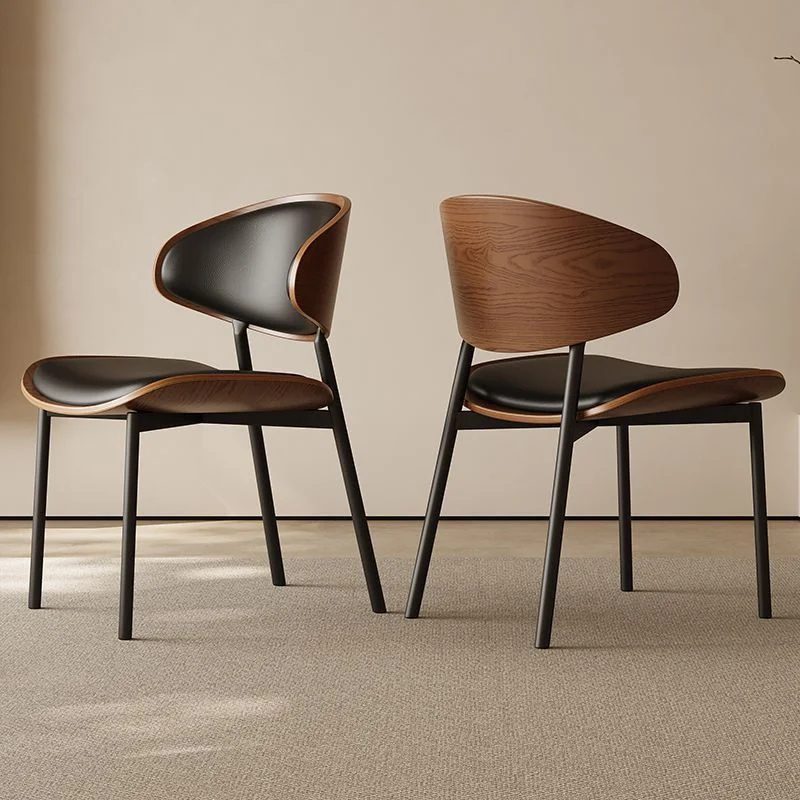 Lot de deux chaises au design moderne caractérisé par une coque en bois cintré et un rembourrage en cuir noir. Le dossier incurvé et le piètement fin en métal noir offrent une esthétique élégante et un excellent confort d’assise.
