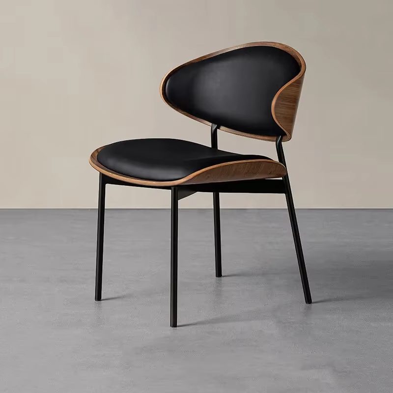 La chaise est encadrée par des éléments en bois courbé (similaire au noyer, visible sur l’image), créant une silhouette douce et sophistiquée qui contraste magnifiquement avec le rembourrage noir.