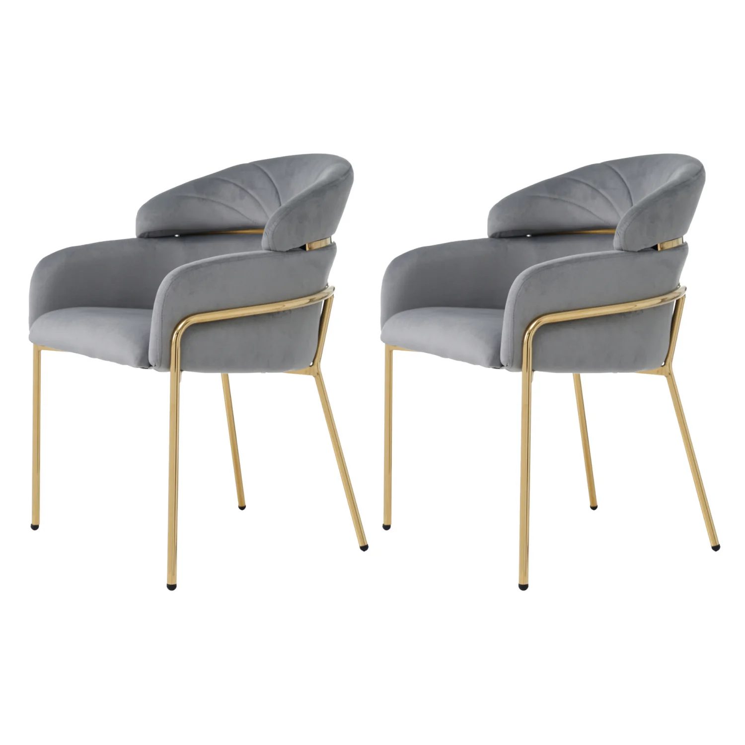 Lot de 2 chaises de salle à manger au design de luxe léger, caractérisées par leur revêtement en velours gris et leurs pieds élancés en métal doré. Elles offrent un grand confort ergonomique.