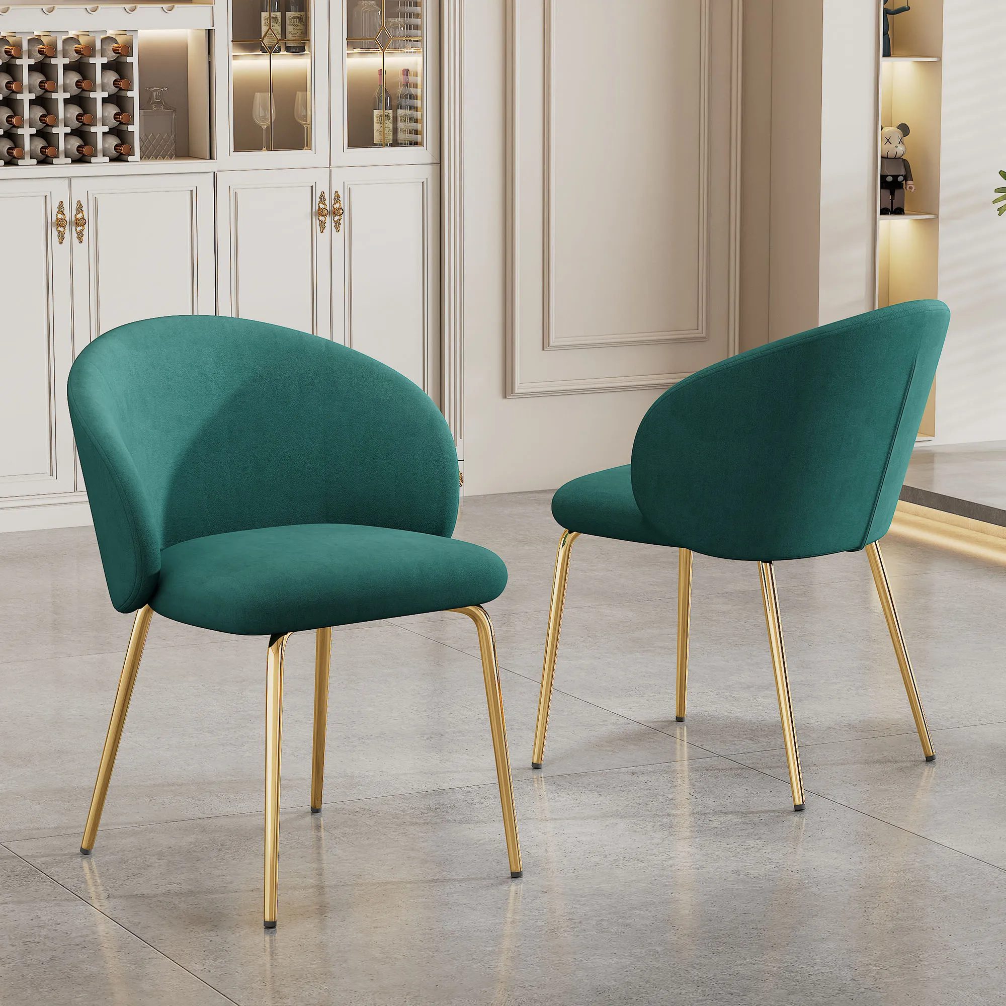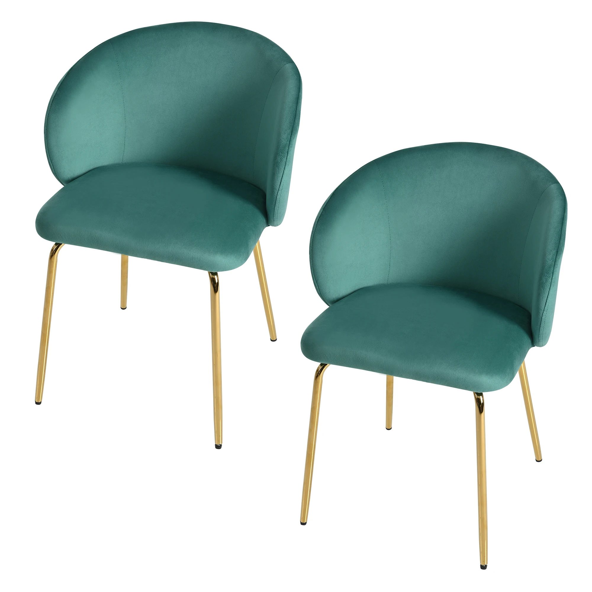 Lot de deux chaises au design moderne et élégant avec une silhouette minimaliste. Elles offrent un confort ergonomique grâce à un dossier incurvé enveloppant et une assise rembourrée de velours vert émeraude.