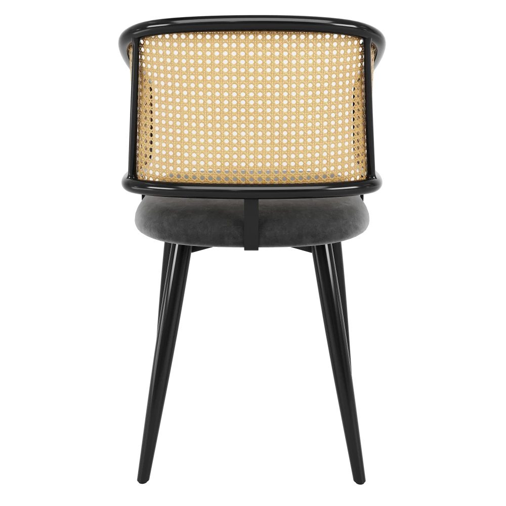 Lot de deux chaises combinant le confort luxueux du velours gris et la légèreté du dossier en rotin tressé. La structure ergonomique et les pieds en métal noir haute résistance avec effet bois assurent à la fois style, stabilité et durabilité.