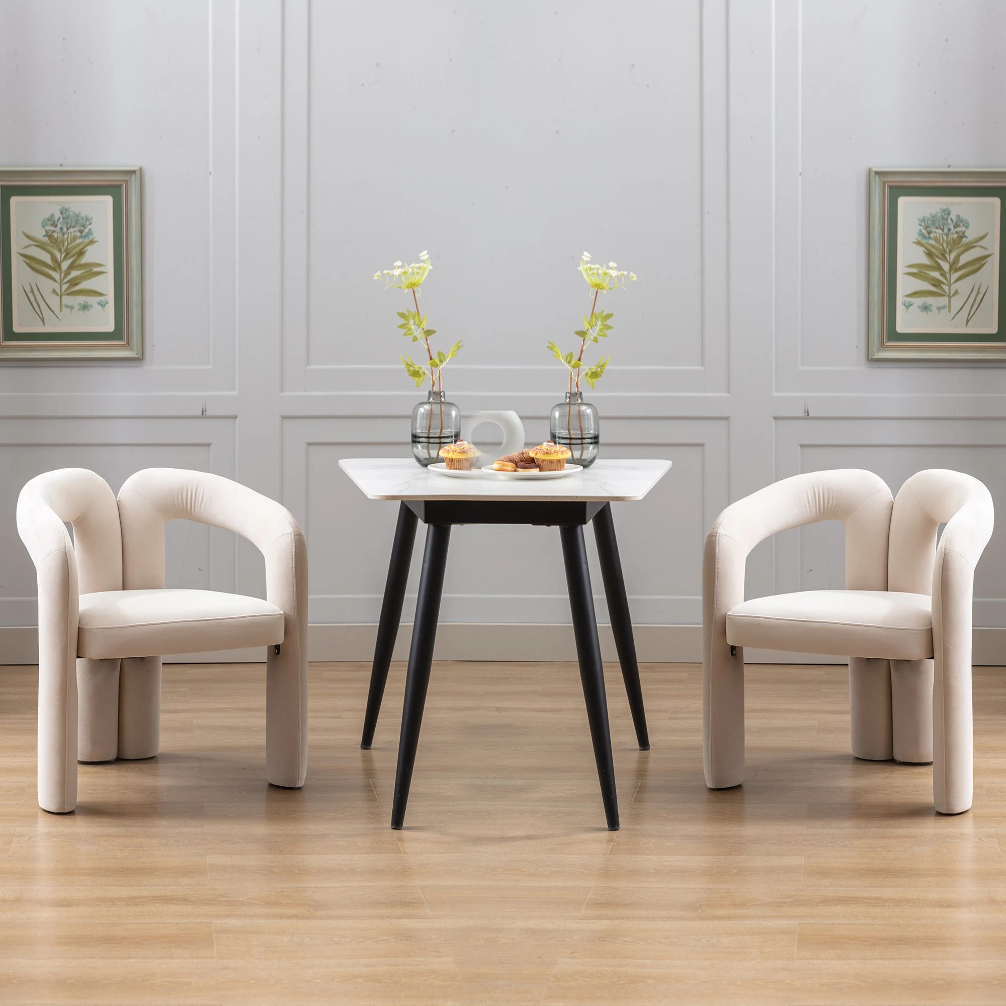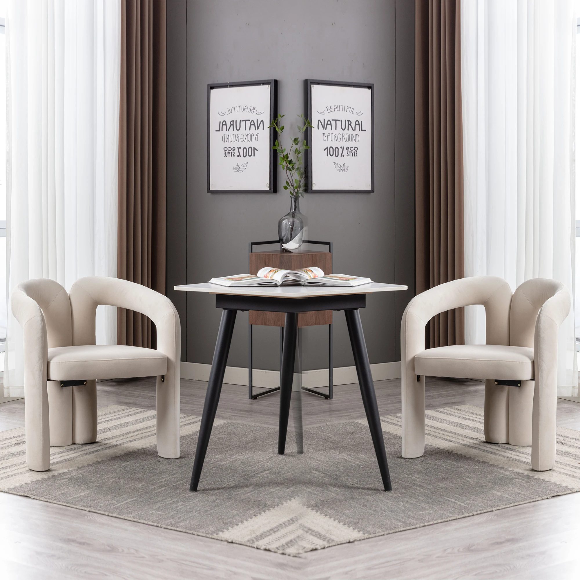 La chaise est conçue pour le confort, avec une assise généreusement rembourrée de mousse haute densité et enveloppée d’un tissu velours (T Velour) doux. Le style est Nordique, avec un dossier au design ouvert. La structure est robuste et stable, soutenue par des pieds en métal (Matériel de Jambe Métal). La chaise a une capacité de charge de plus de 150 kg. L’assemblage est simple et ne nécessite pas d’expertise particulière.