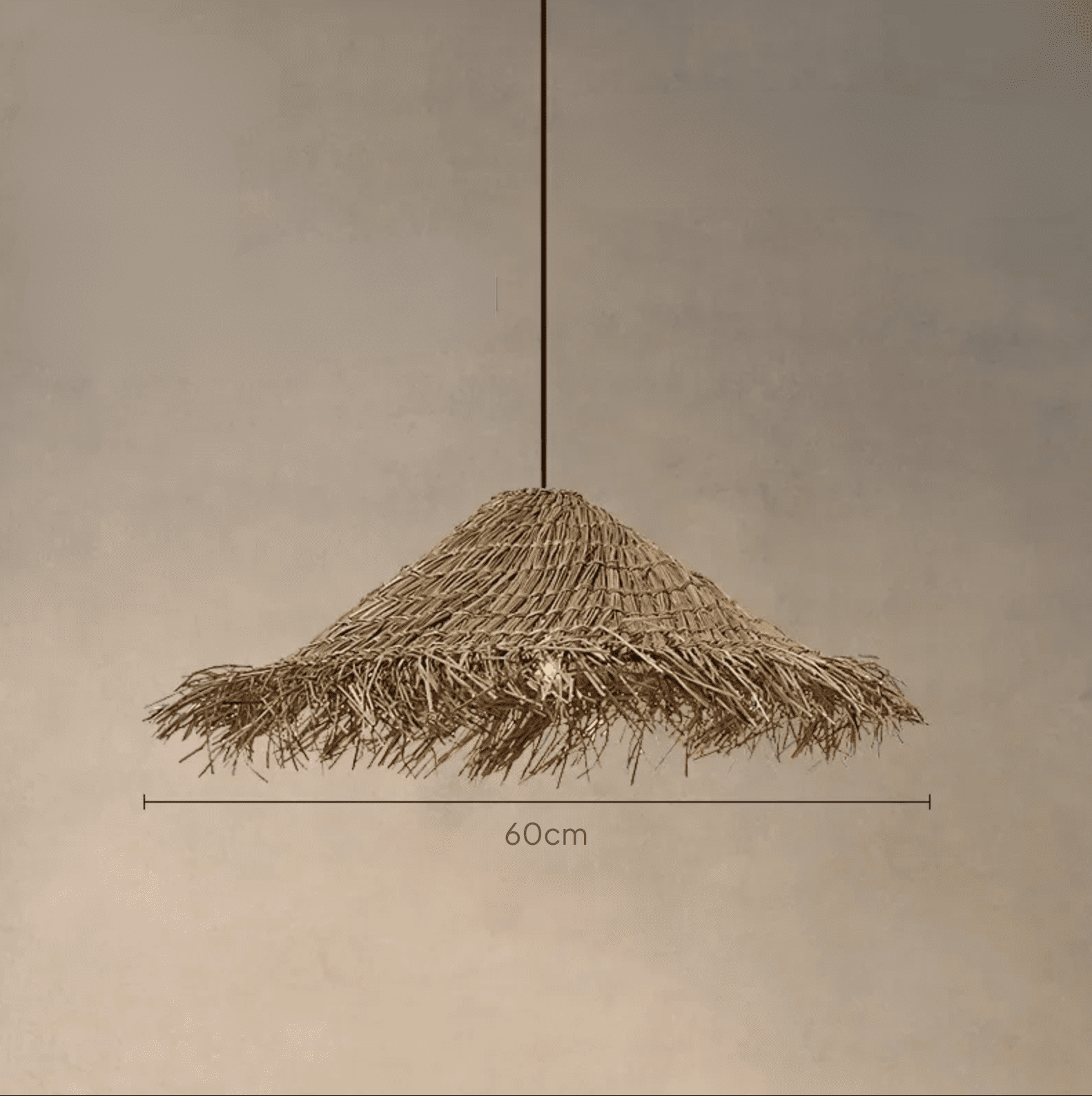 Suspension au design européen moderne/bohème réalisée en paille naturelle tressée à la main. Avec un diamètre de 60 cm, elle est idéale pour créer une ambiance chaude et décontractée dans le salon ou la salle à manger.