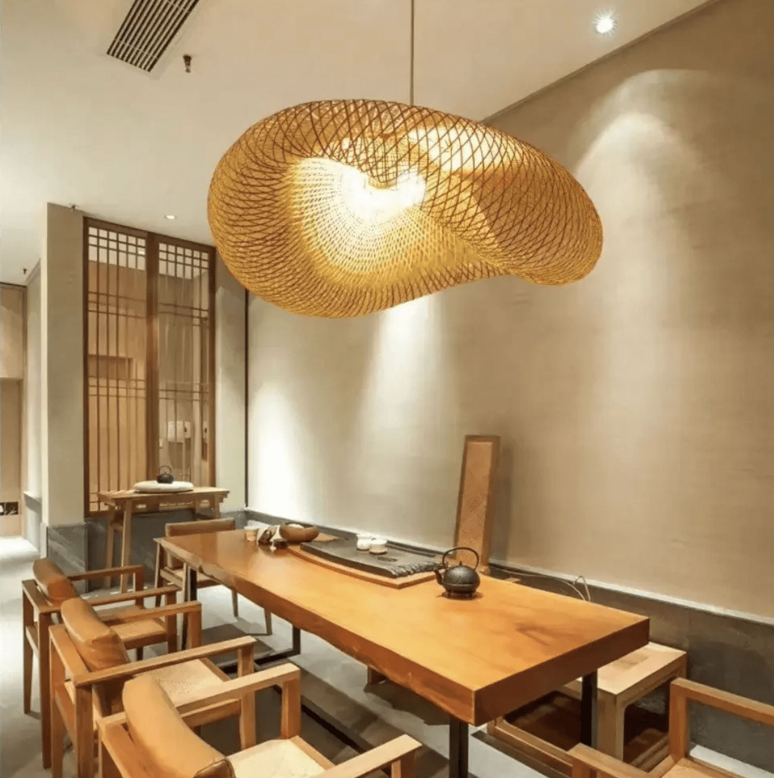 Lustre au design créatif et artisanal inspiré de l’esthétique japonaise. Il est fabriqué en bambou tressé à la main pour former une silouhette de vague ou de « nid d’oiseau ».