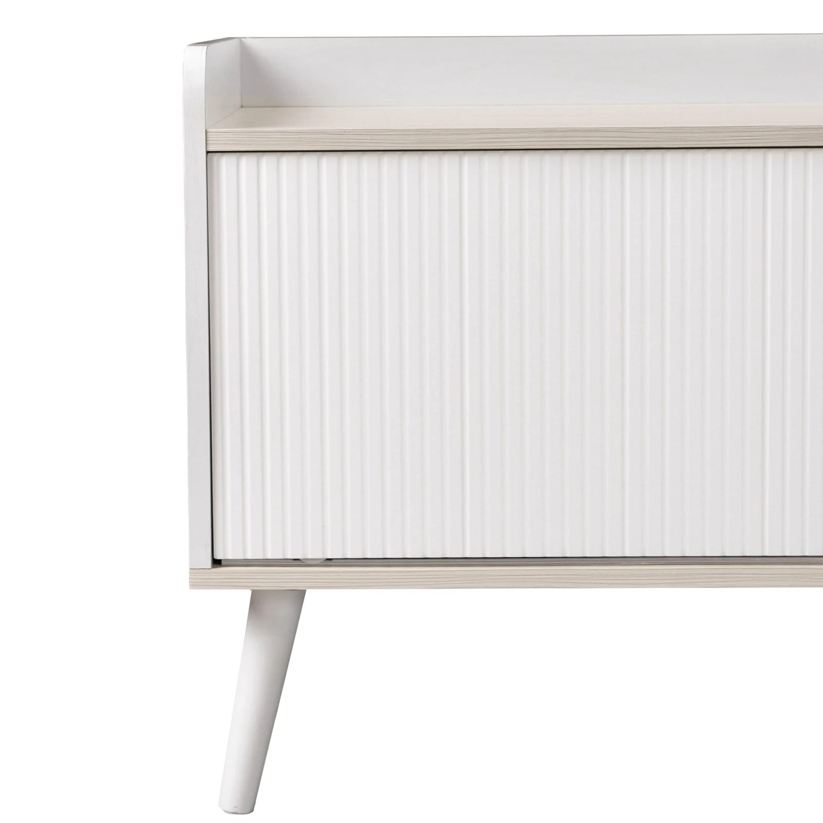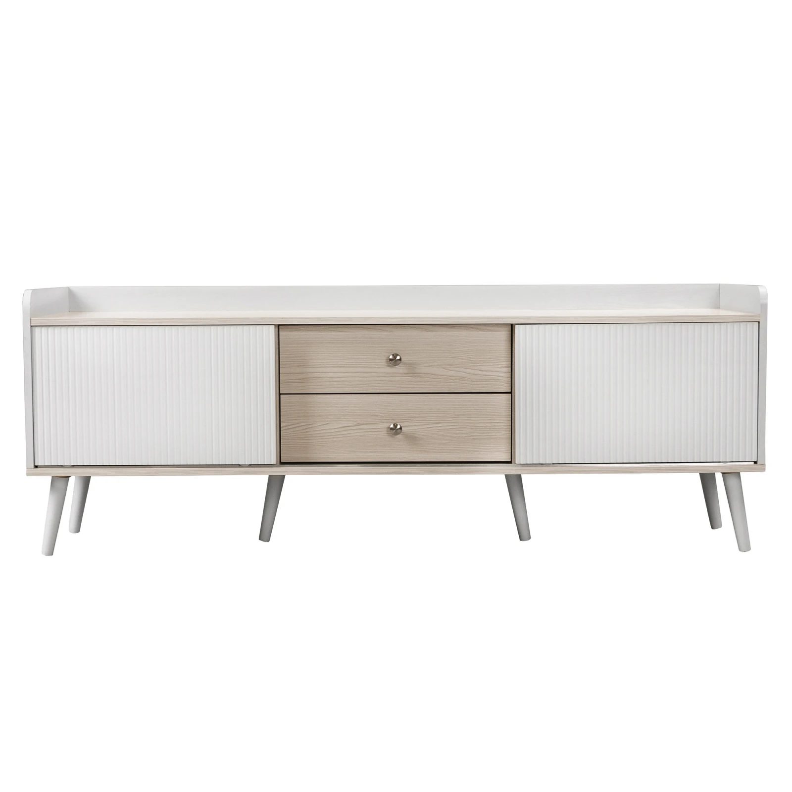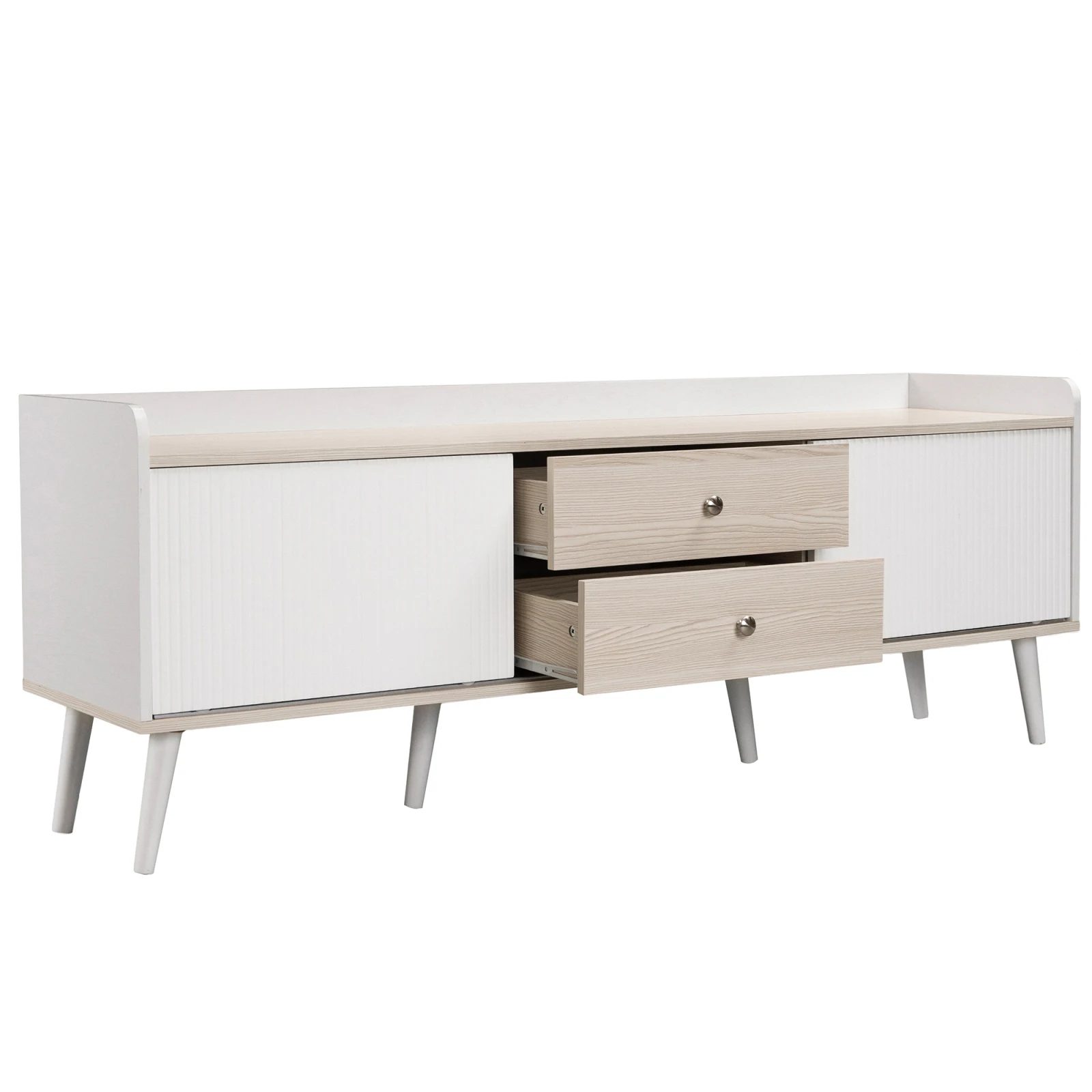 Meuble TV moderne et chic mêlant blanc et bois naturel. Ses portes coulissantes rayées et tiroirs offrent un grand rangement. Robuste et élégant, il apporte style et praticité au salon.