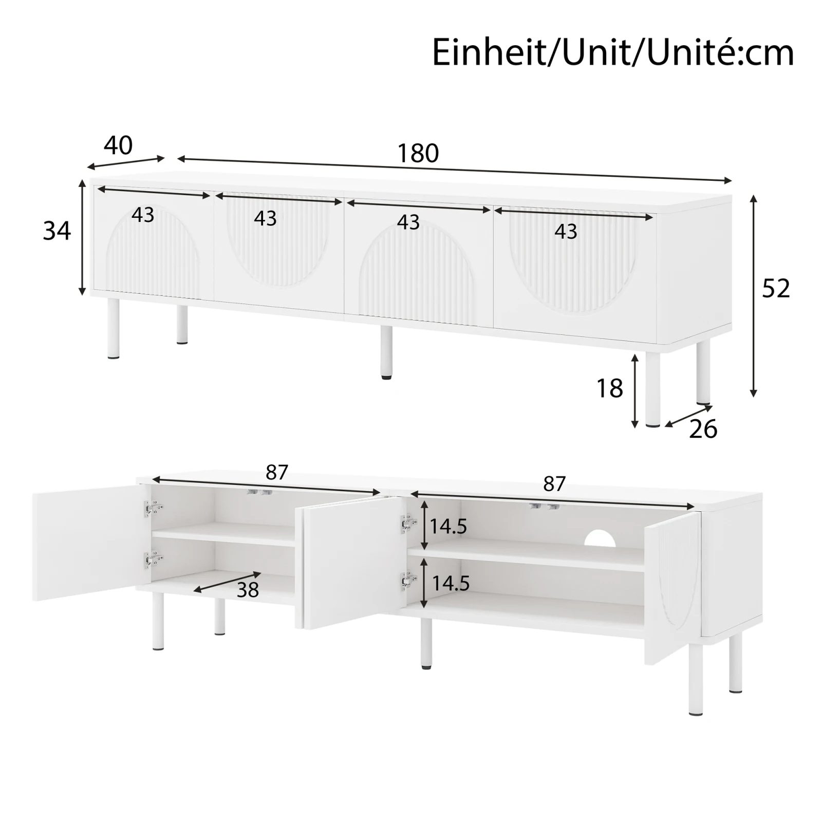 Ce meuble n’est pas seulement un bel objet de décoration, il est aussi extrêmement pratique. Avec une largeur de 180 cm, il offre un espace de rangement généreux, incluant quatre compartiments spacieux pour vos consoles, routeurs, DVD et autres accessoires. Des ouvertures pour câbles sont intégrées, permettant de dissimuler les fils et de maintenir votre espace de vie organisé.