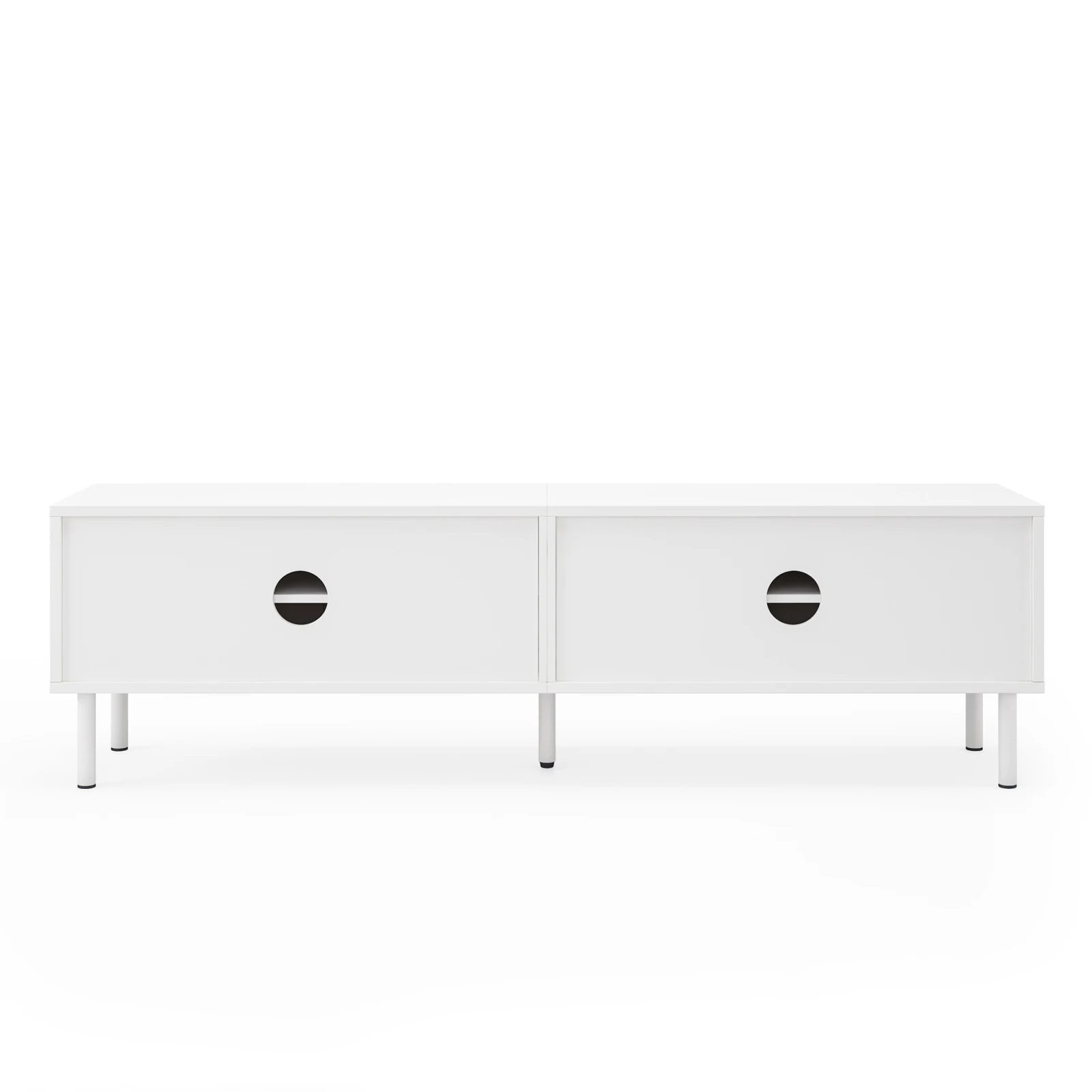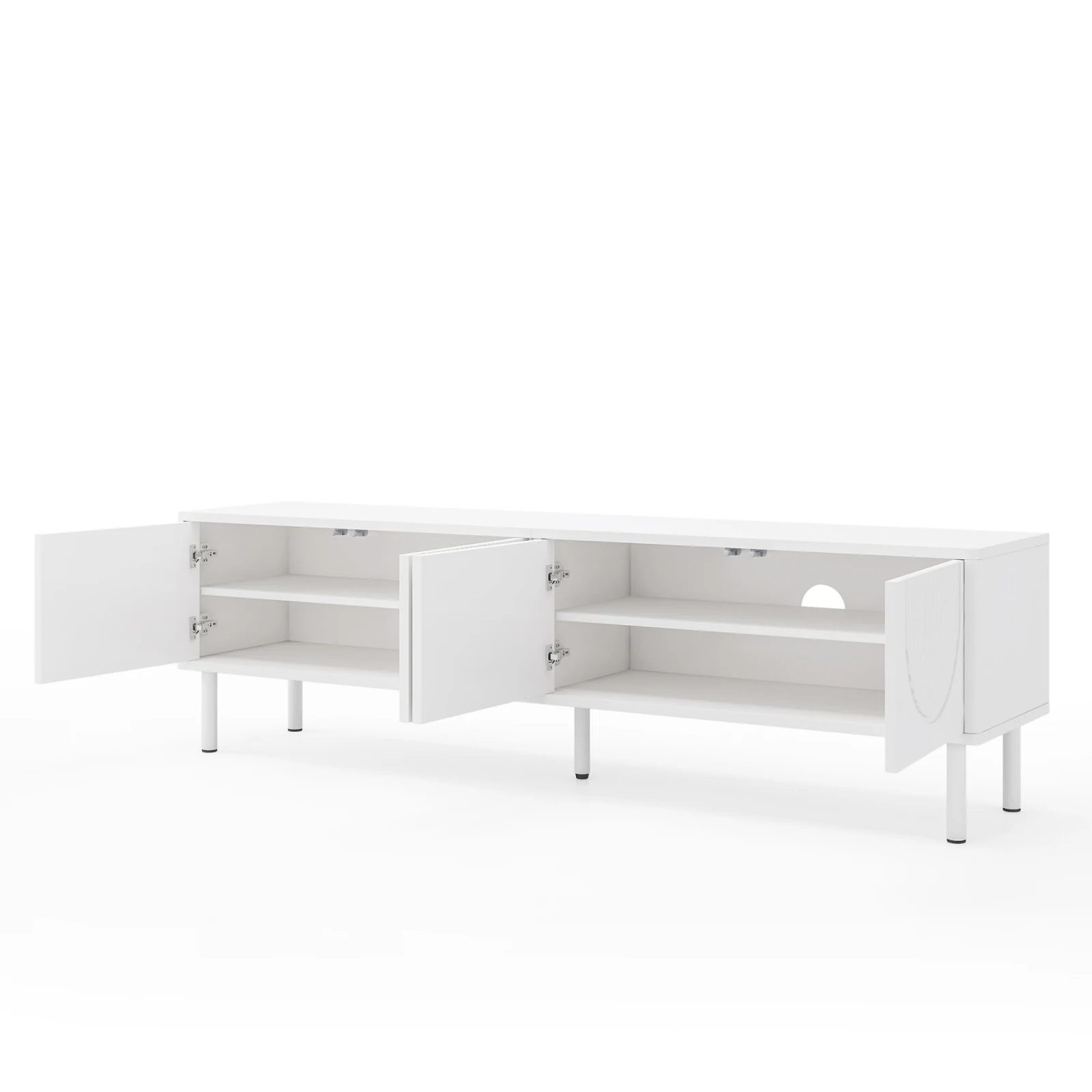 Ce meuble TV blanc mat au design minimaliste se distingue par ses portes ornées de motifs géométriques. Avec de généreux espaces de rangement, des ouvertures pour les câbles et des pieds ajustables, il est à la fois élégant et fonctionnel, idéal pour un intérieur moderne et ordonné.