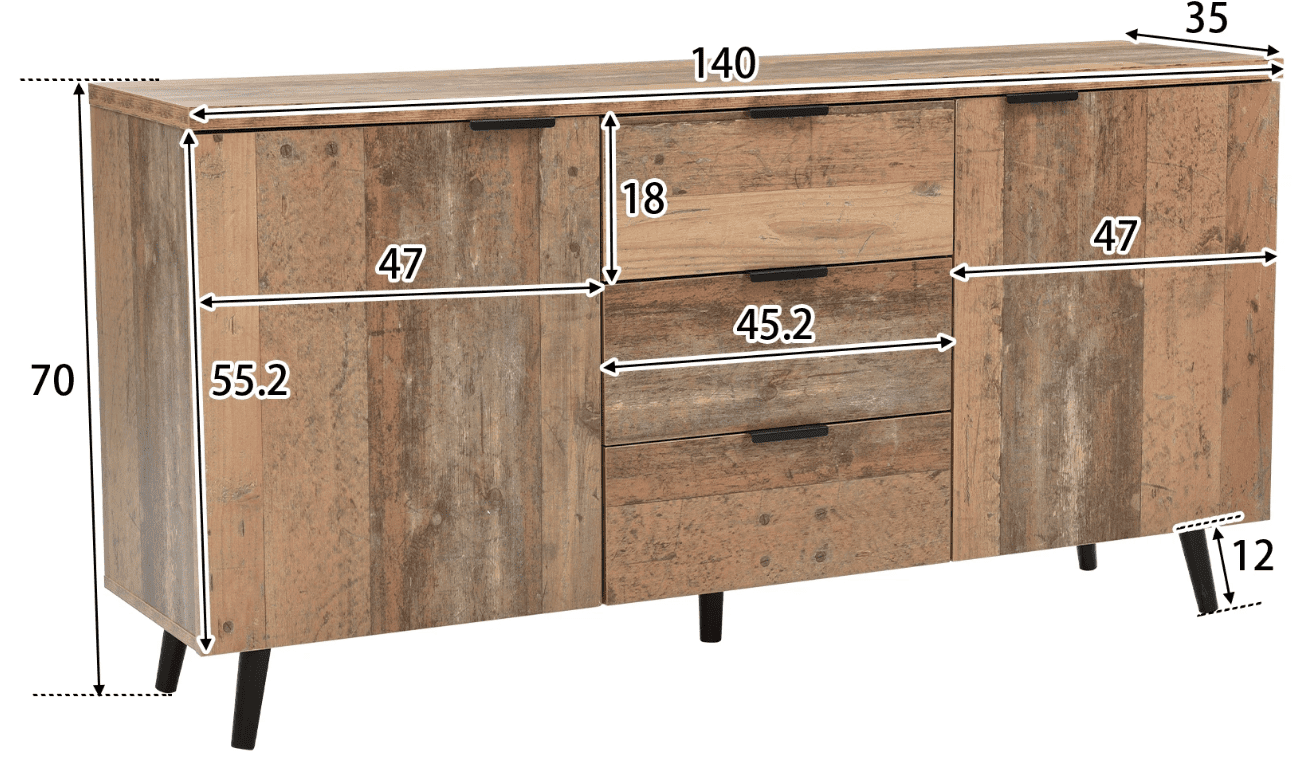 - Dimensions totales : 140 cm (longueur) x 35 cm (profondeur) x 70 cm (hauteur)
