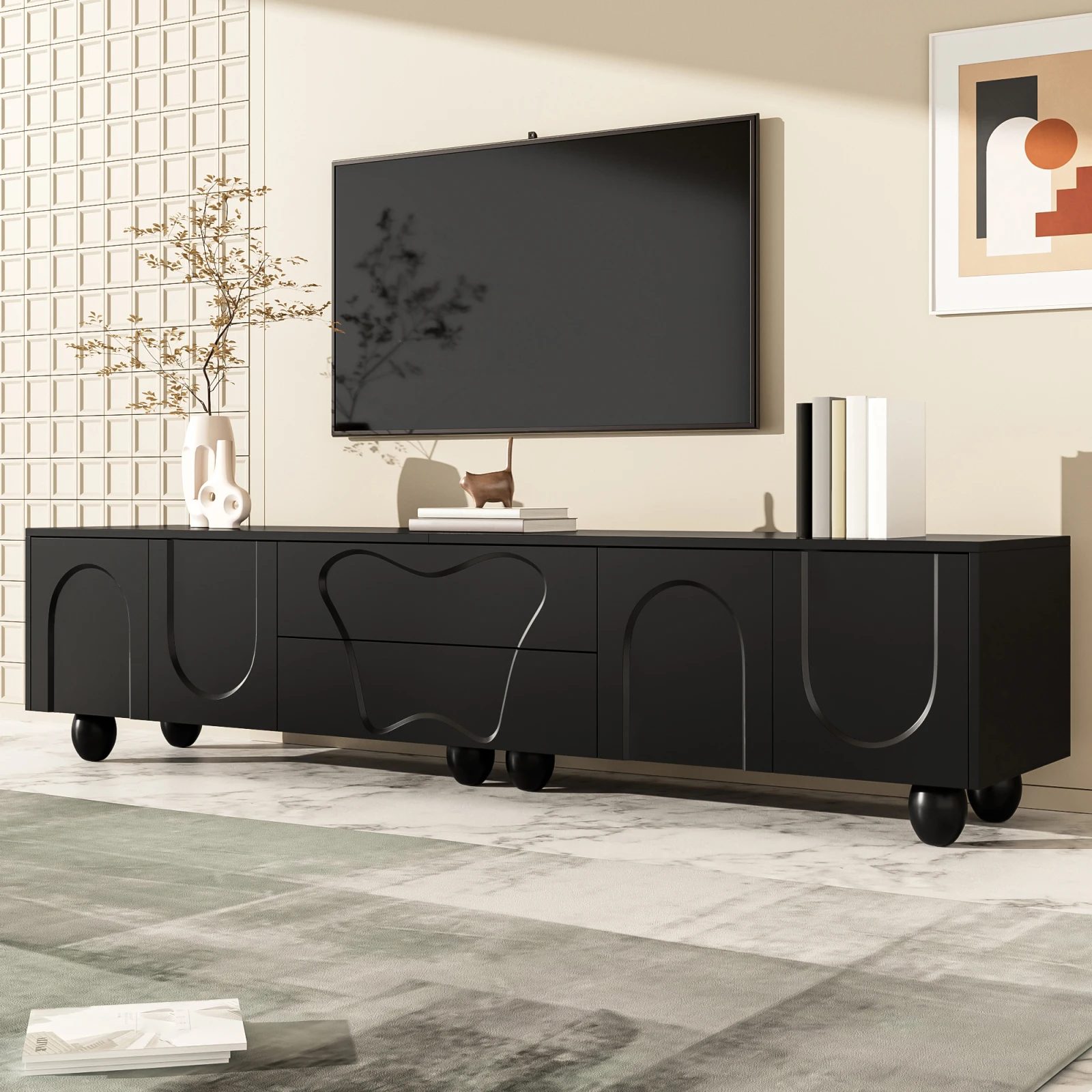 Ce meuble TV, au design minimaliste et à la finition noir mat, se distingue par ses portes courbées. Il offre des rangements généreux pour un salon élégant et organisé.