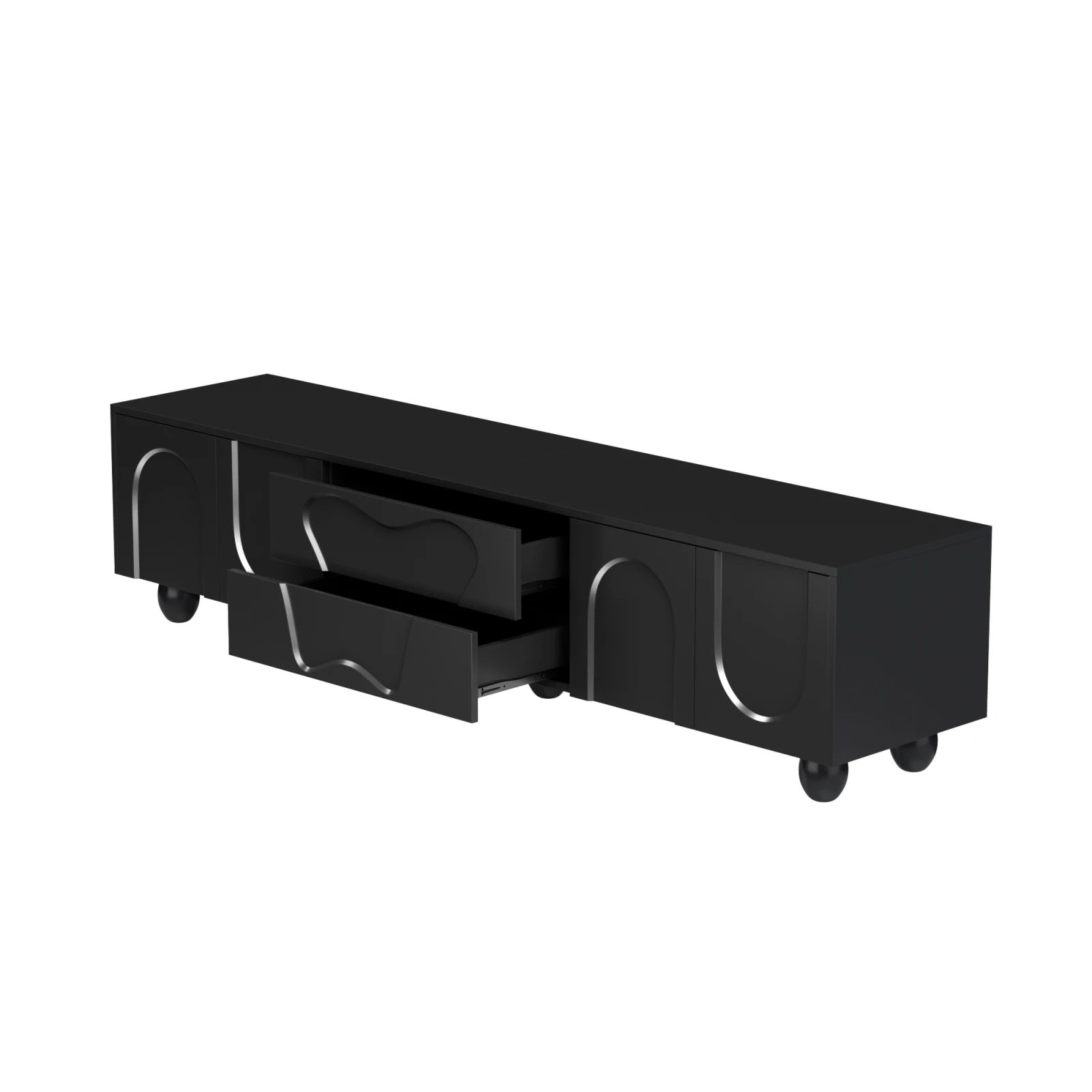 Ce meuble TV allie un design moderne et une fonctionnalité optimale. Sa finition noir mat est à la fois facile d’entretien et résistante aux rayures, et ses portes incurvées lui donnent une allure sophistiquée qui en fait une véritable œuvre d’art dans votre intérieur.