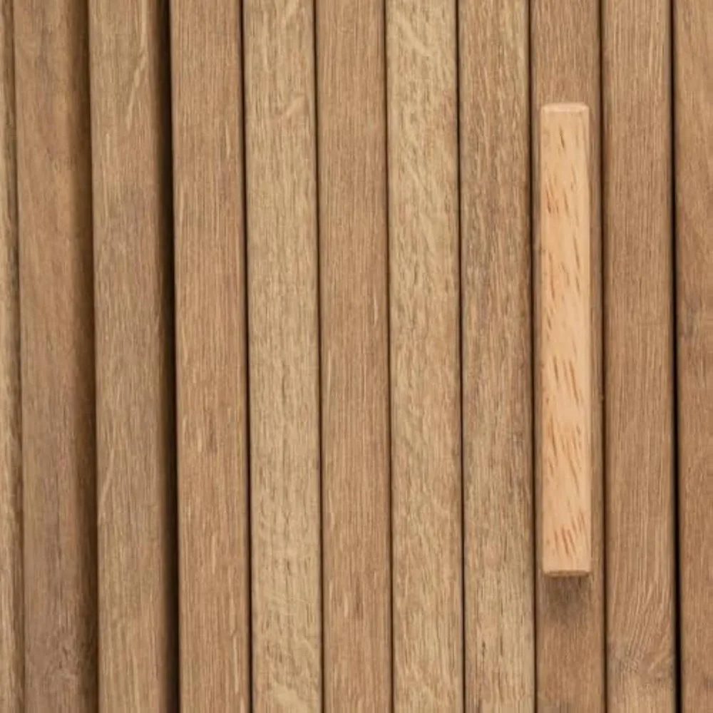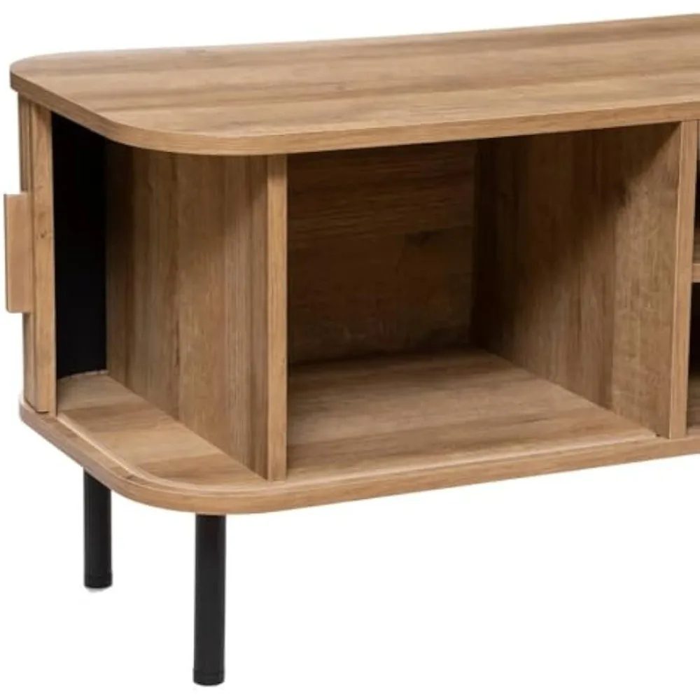 Ce meuble TV, au design scandinave, se distingue par sa finition aspect chêne et ses portes coulissantes à la texture cannelée. Il offre des rangements pratiques et une structure robuste et durable pour votre salon.