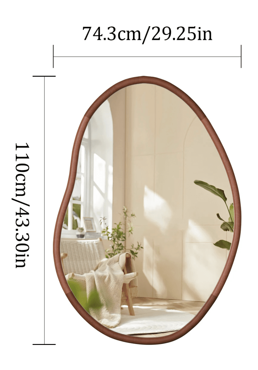 Grand miroir mural décoratif de forme asymétrique et organique. Il est doté d’un cadre en Bois de Hêtre Massif pour un look naturel et chaleureux.