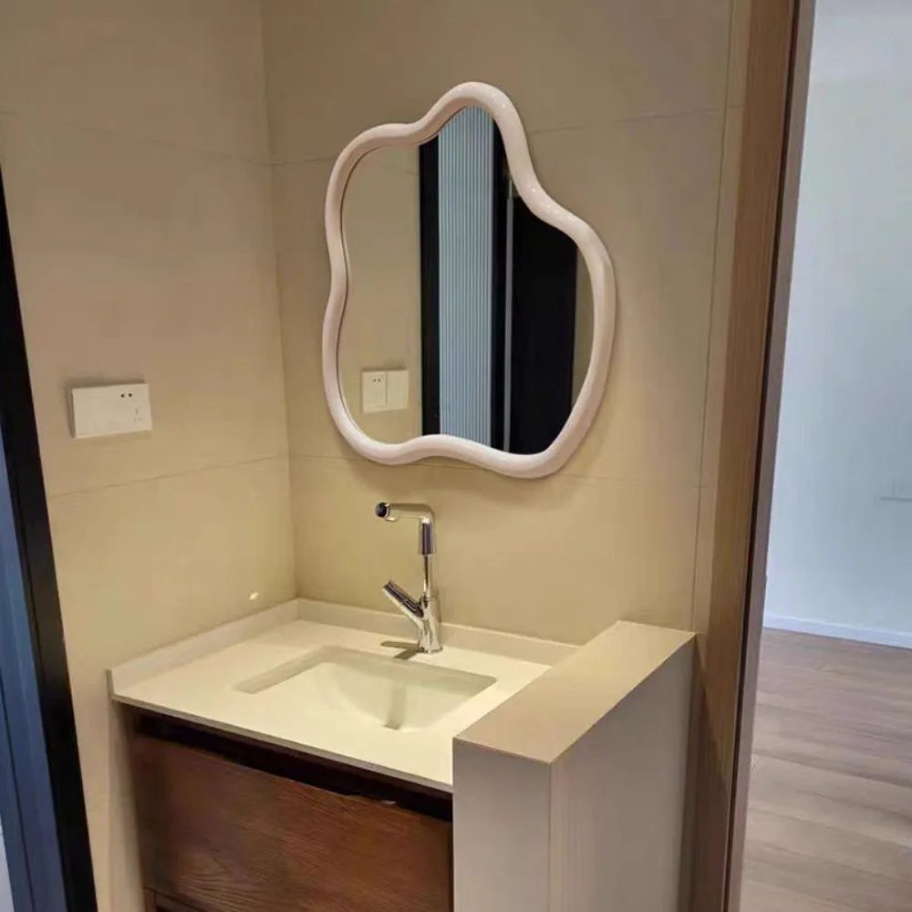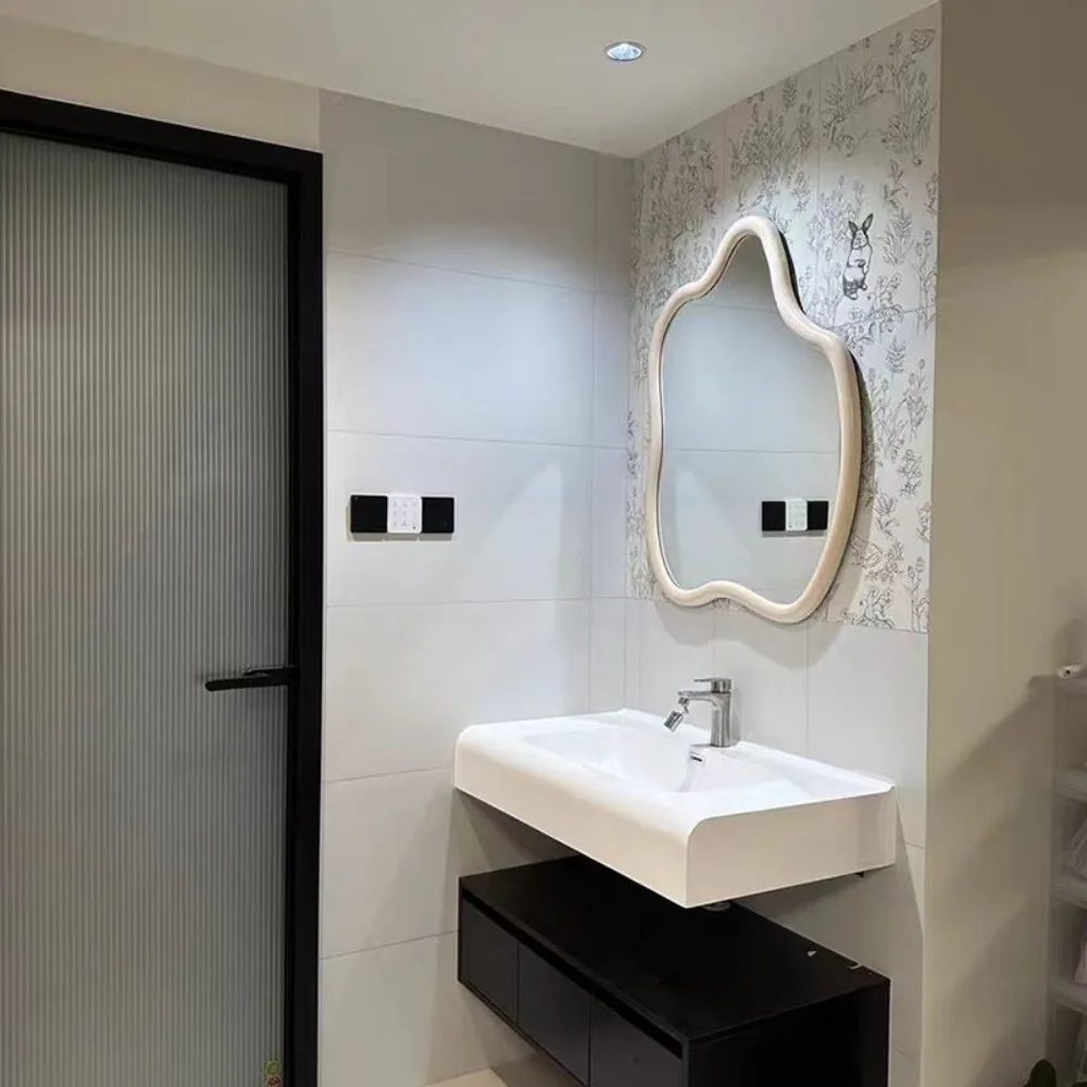 Ce miroir mural est un incontournable du design moderne et simple. Sa forme irrégulière, souvent décrite comme organique ou amiboïde, apporte une touche d’originalité et de douceur qui contraste avec les lignes géométriques classiques. La silhouette volumineuse du cadre en fait une véritable pièce maîtresse décorative.