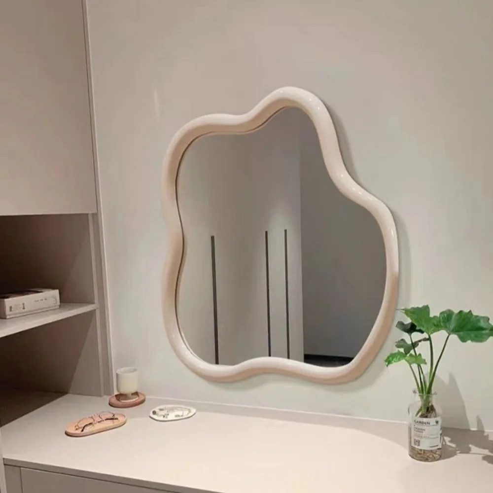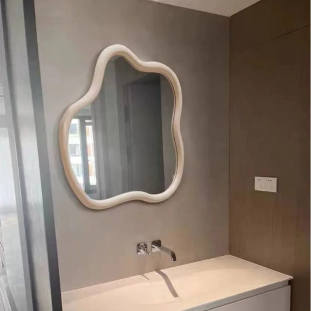 Miroir mural décoratif de style Simple et Moderne avec une forme irrégulière et organique très tendance. Le cadre est fabriqué en bois.