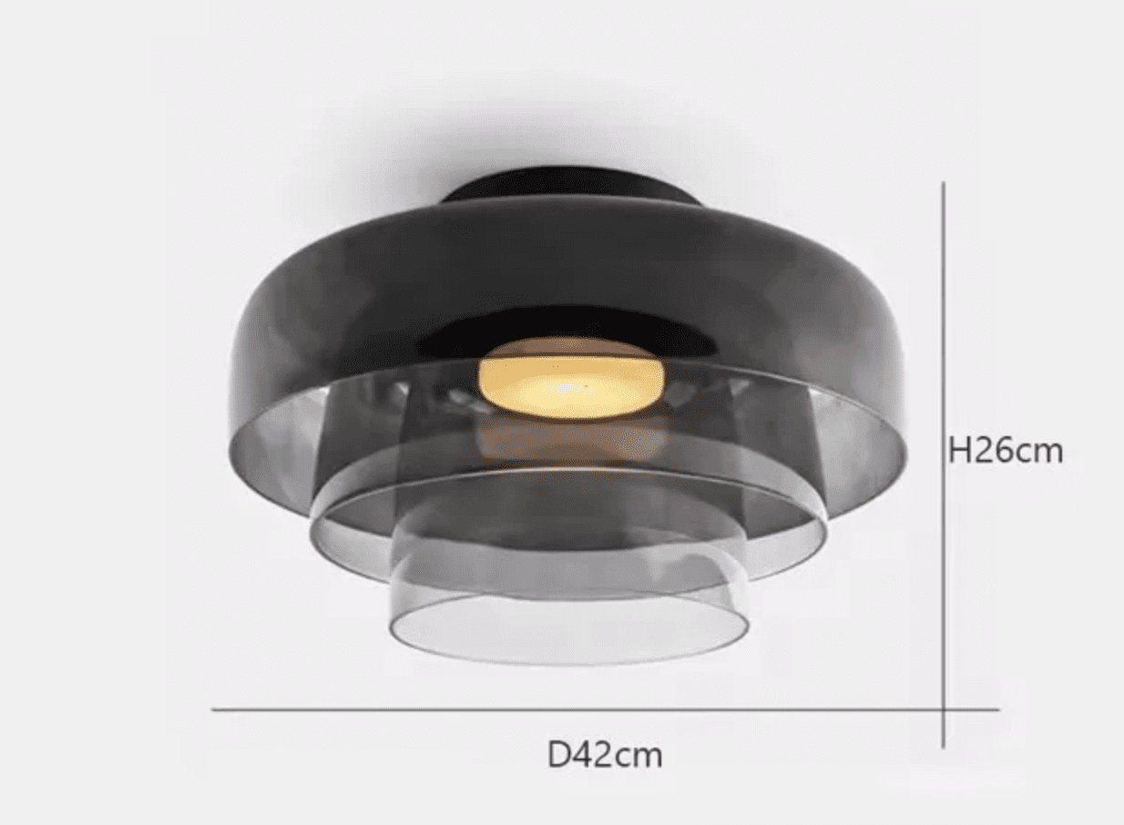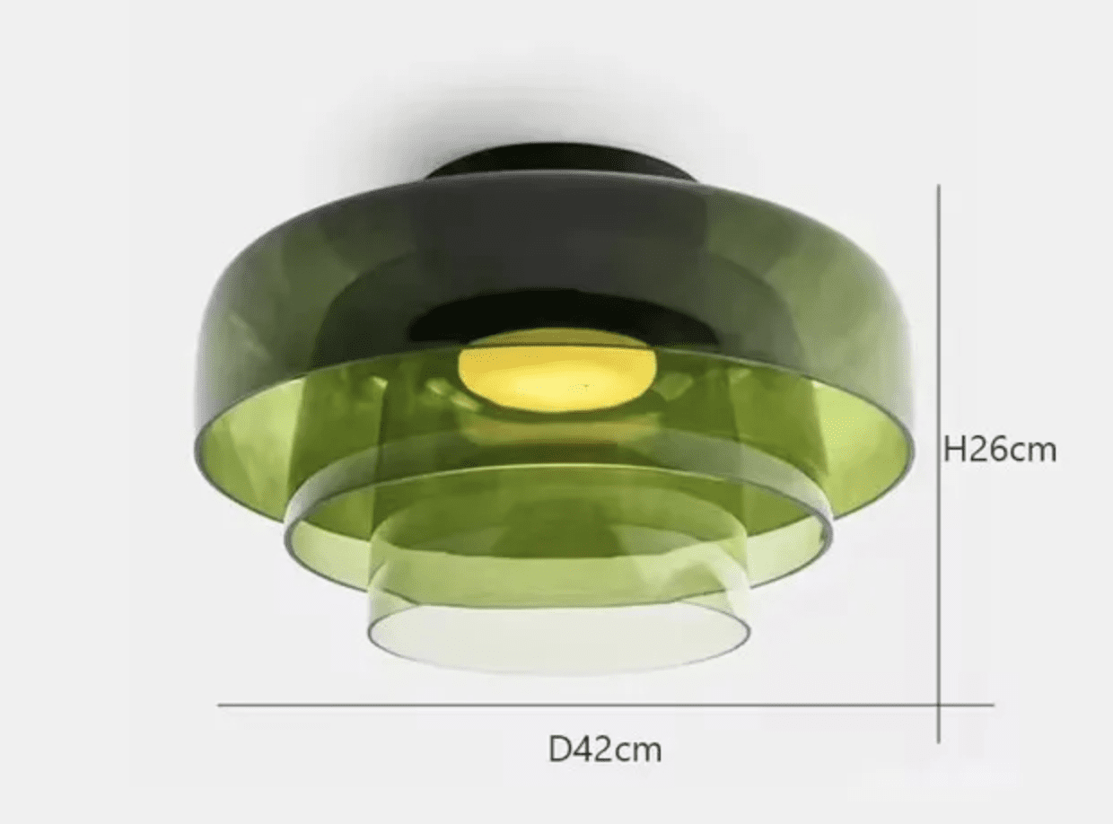 Ce plafonnier est une pièce décorative forte qui apporte une touche de sophistication vintage revisitée à votre espace. Le design de l’abat-jour en verre empilé et coloré assure une diffusion de lumière unique et chaleureuse, parfaite pour créer une ambiance distincte.