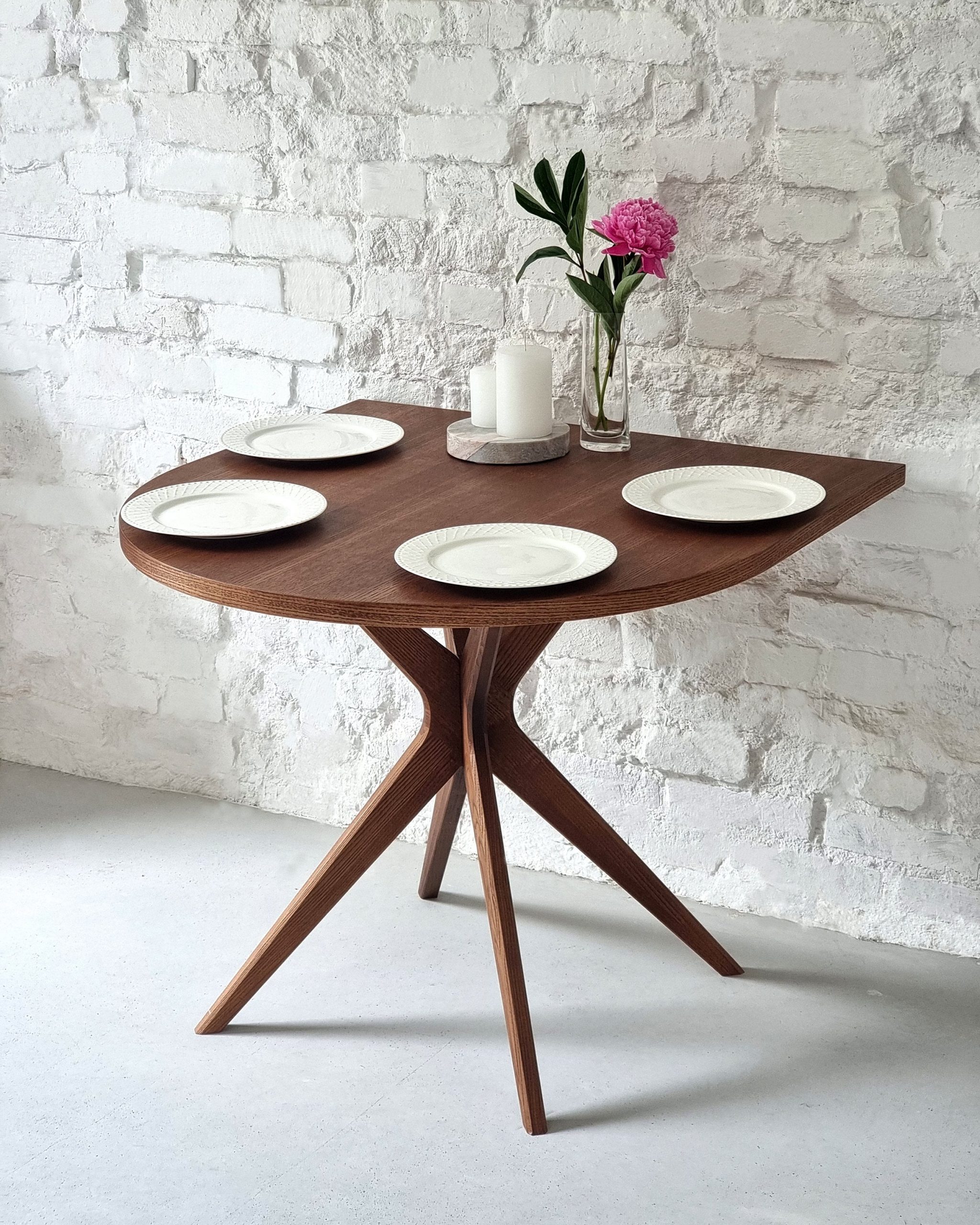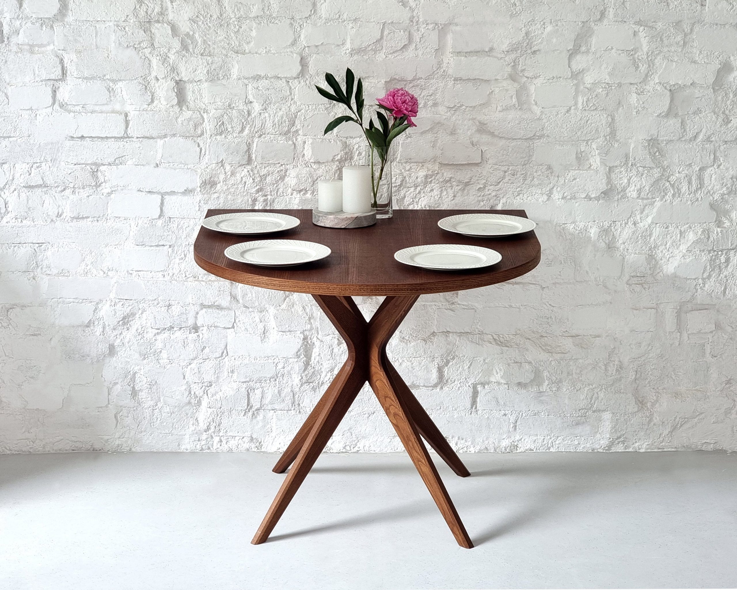 Le plateau est en placage de frêne de haute qualité et repose sur un piètement en X entrecroisé en bois de frêne massif, conférant à la table un look moderne. Grâce à ce piètement central, vous bénéficiez de toute la longueur des bords de la table, maximisant l’espace pour les jambes des convives. Elle est un excellent choix pour remplacer une petite table ronde ou une table à abattants.