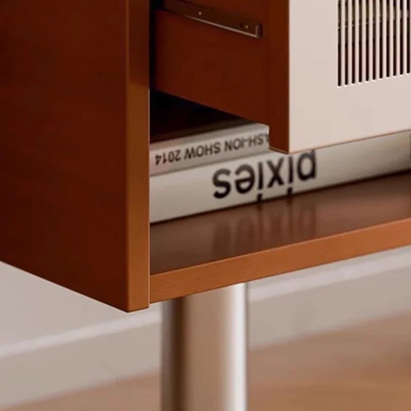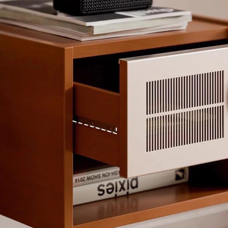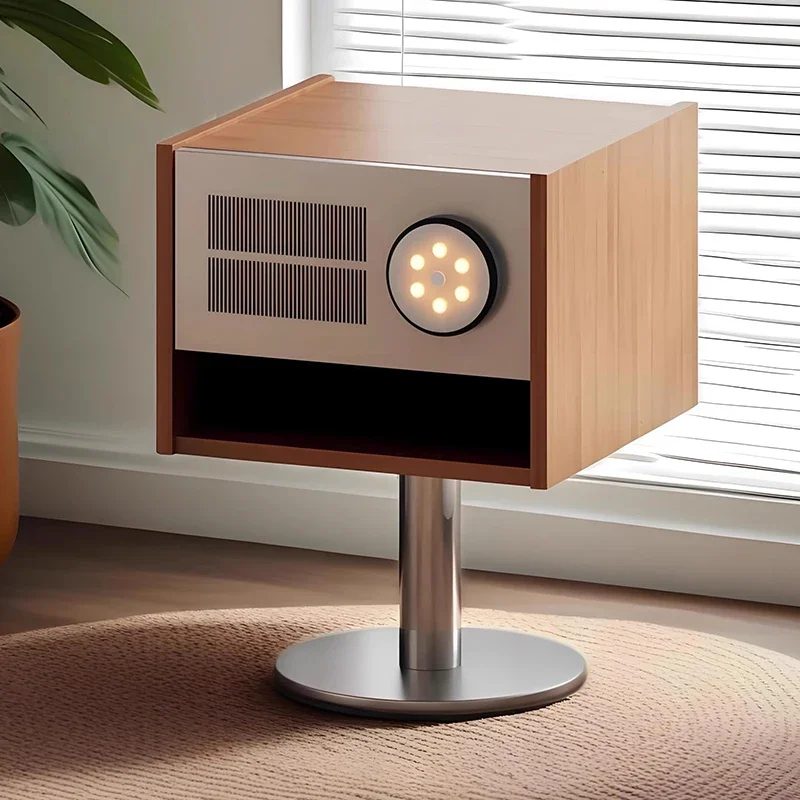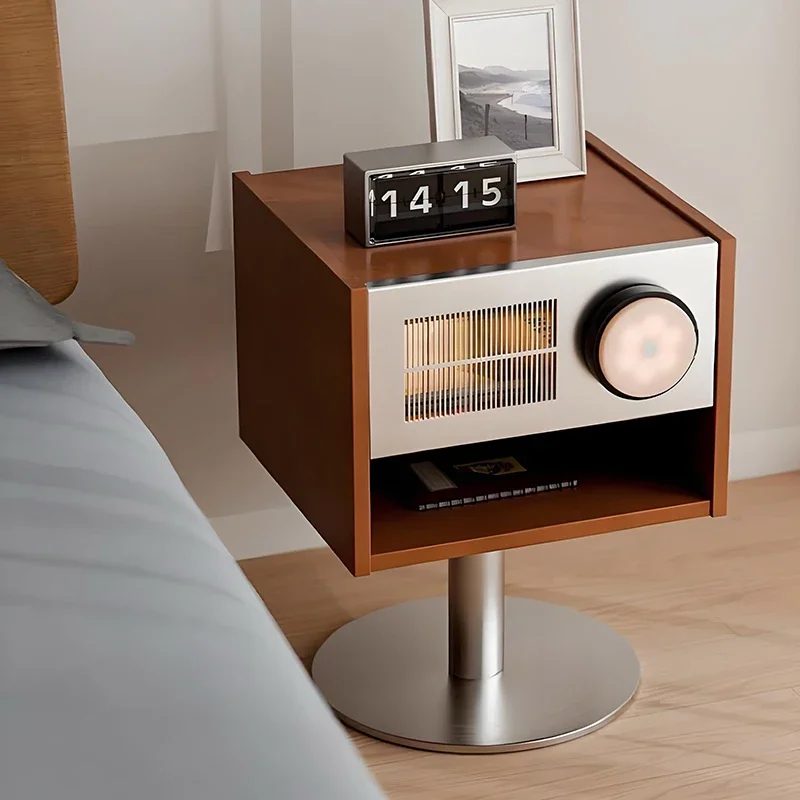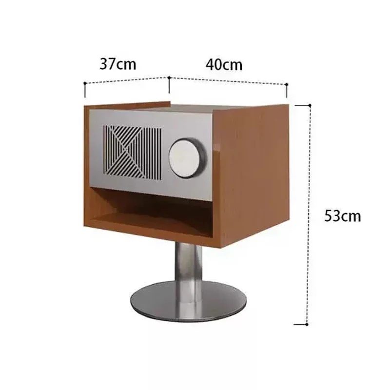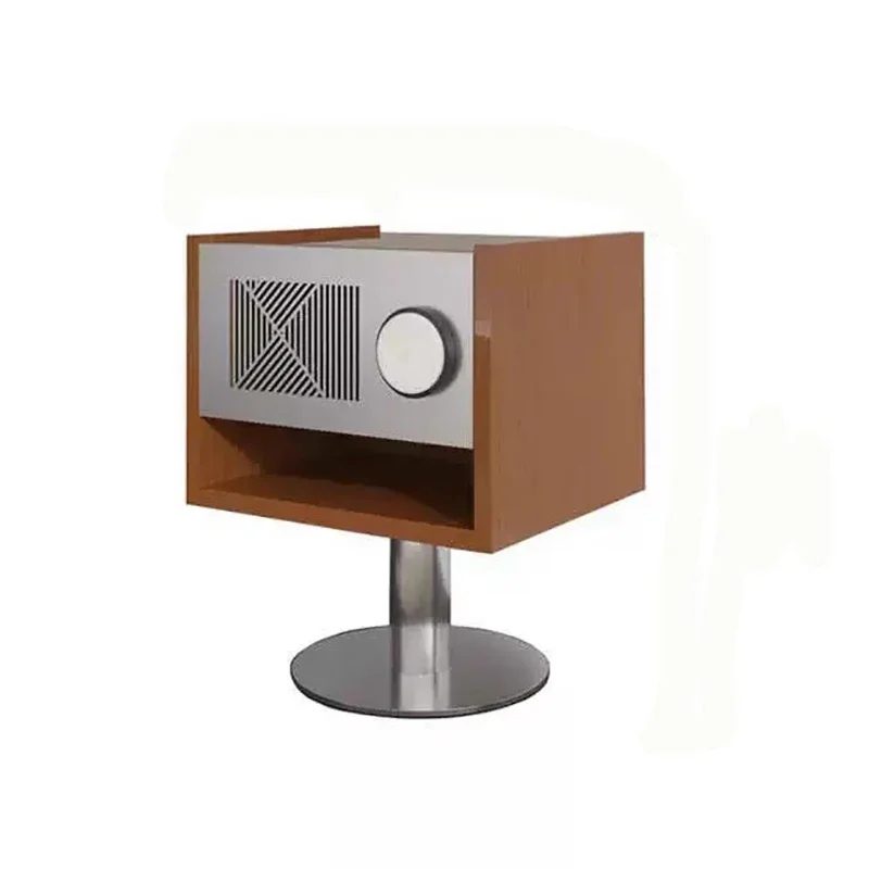 Cette table de chevet est conçue pour être une pièce maîtresse dans la chambre à coucher. Son design unique fait le lien entre le style vintage du bois et les accents modernes du métal. Le panneau frontal audacieux (avec un grand bouton circulaire et une grille) lui donne l’allure d’un poste radio rétro, combiné à la fonctionnalité moderne d’un meuble de rangement.